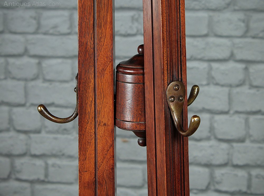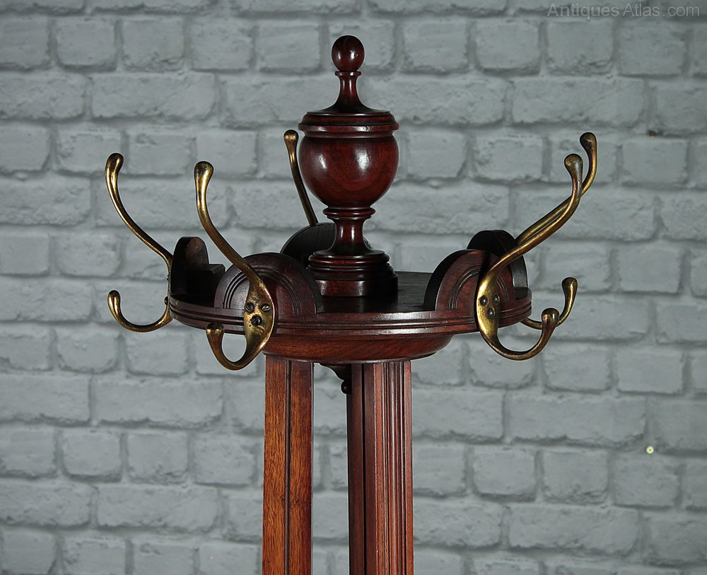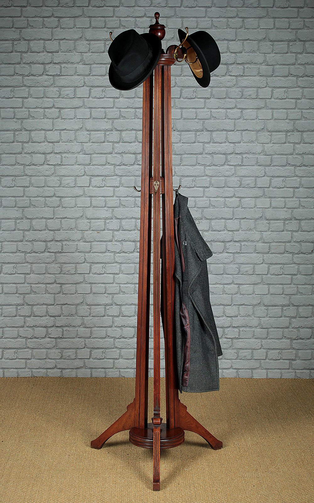 Smart Edwardian walnut hall stand c.1910. Revolving crown of five large brass double hooks for hats and coats etc. Raised on three long reeded supports with three smaller hooks at a lower level, ideal for children’s coats. Crisp turned finials to the top, centre brace and base. Raised on splayed tripod legs for stability. One of the upper hooks is a well matched period replacement, otherwise excellent condition. Cleaned and polished in our workshops.