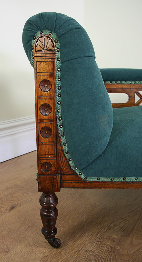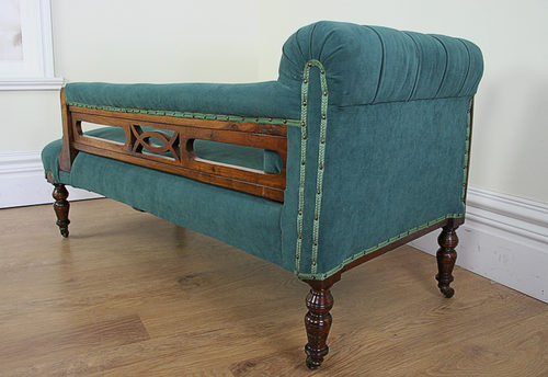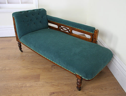 Ref. Chaise No. 15 PriceDelivery to any address in mainland England & Wales is £79. DimensionsExternal height 75.3cm or 2’ 5¾” External width 156cm or 5’ 1½” External depth 66cm or 2’ 2” Seat height 44cm or 1’ 5¼” Seat width 132cm or 4’ 4” Seat depth 60cm or 2’ 0” Category Antique Furniture Date Circa 1901 - 1910 Edwardian Antiques Material Walnut Origin English Condition In excellent condition. The arms and back of the couch are firm. The chaise has been recently re-upholstered in the turquoise blue cotton draylone upholstery you see. There are no marks, tears or rips to the upholstery. The braiding is in excellent condition and is firmly attached to the couch. The springs in the seat are firm and in good condition. The ceramic mug castors are original. Free of wood worm, solid in joint and ready to use. Item code as236a200 / Chaise Longue No. 15 Status Sold
