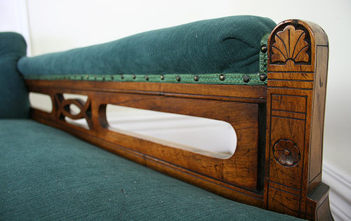 In excellent condition. The arms and back of the couch are firm. The chaise has been recently re-upholstered in the turquoise blue cotton draylone upholstery you see. There are no marks, tears or rips to the upholstery. The braiding is in excellent condition and is firmly attached to the couch. The springs in the seat are firm and in good condition. The ceramic mug castors are original. Free of wood worm, solid in joint and ready to use.