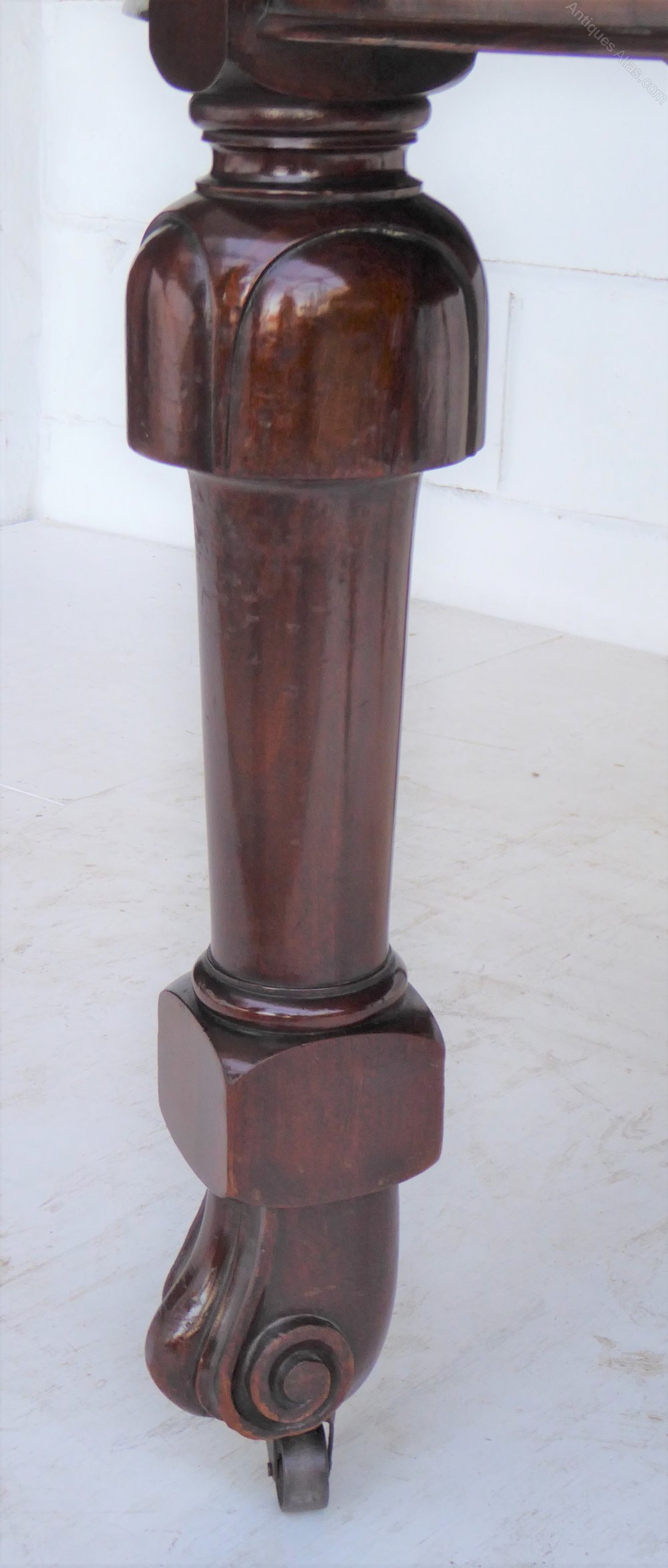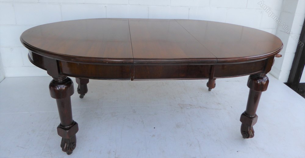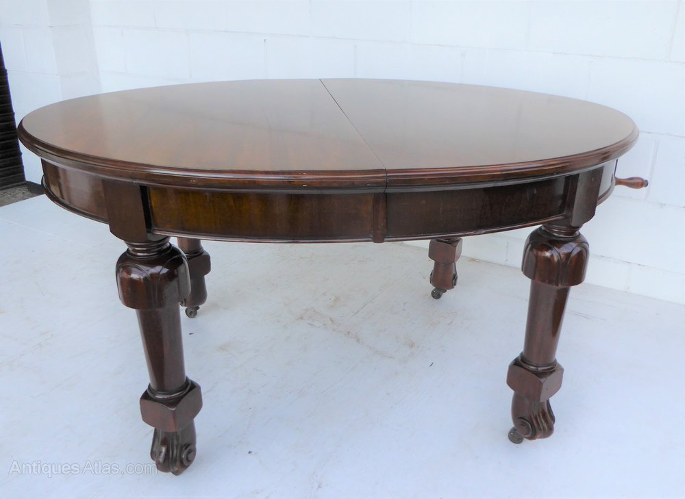 Edwardian two leaf extending wind out Walnut dining table in nice condition, with unusual carved cups, cylindrical legs terminating to scroll feet on castors, fully extended with two leaves would seat eight/ten, with one leaf would seat six and closed without leaves would seat four comfortably.