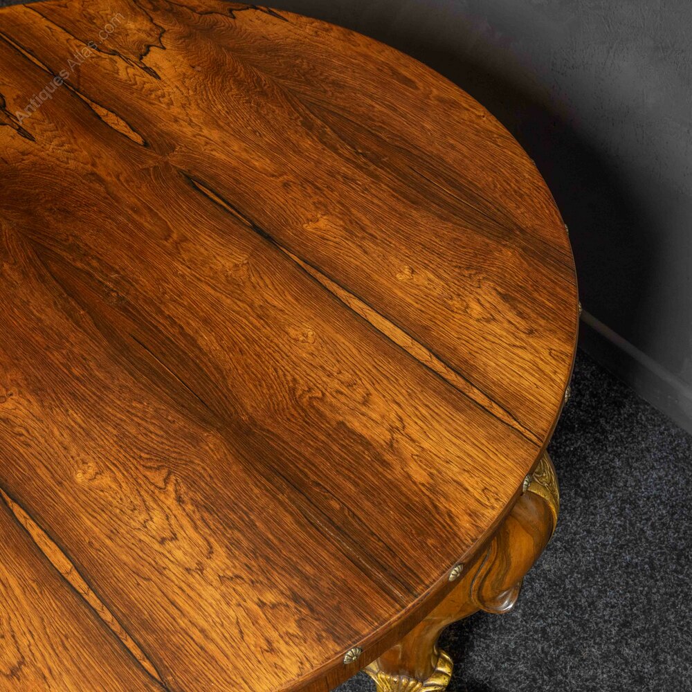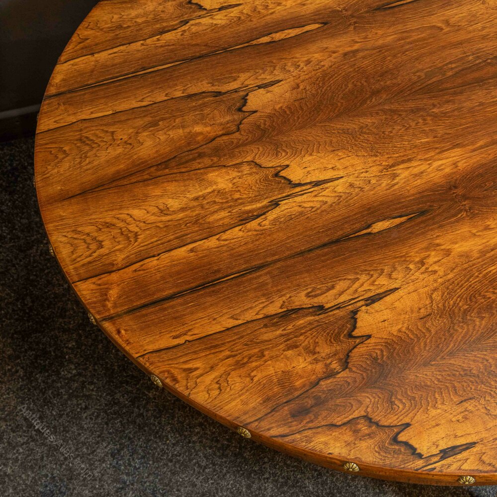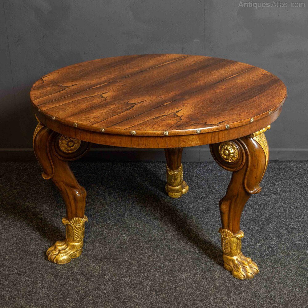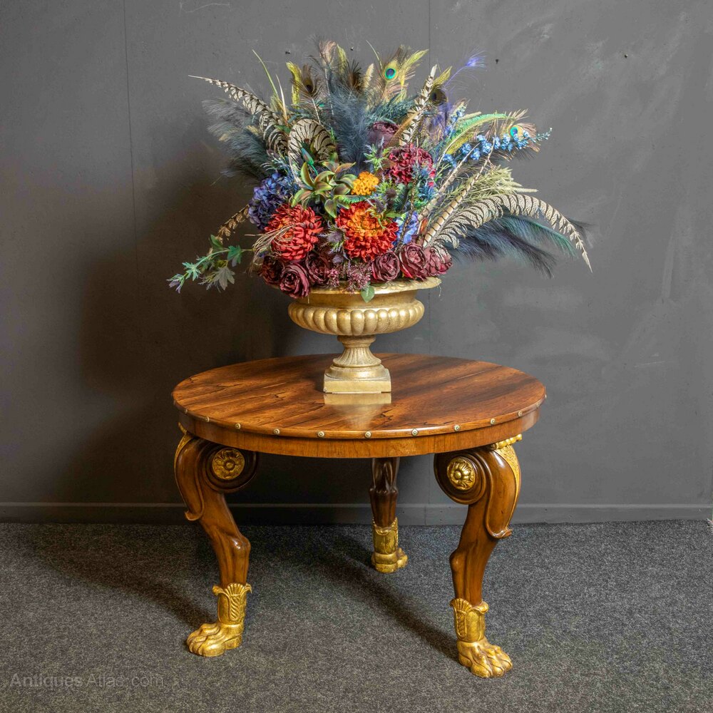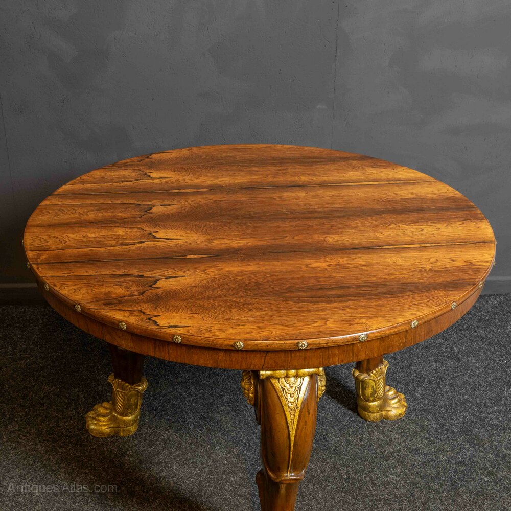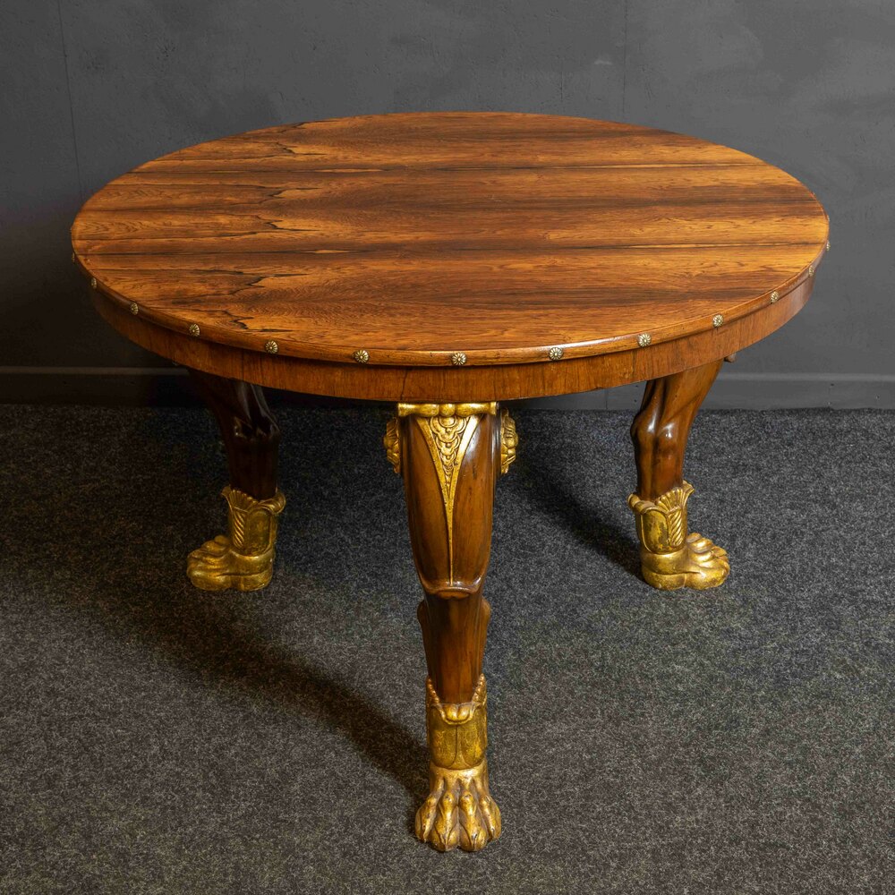 A rare and superb Empire style rosewood centre table of imposing proportions. The re-polished top has a brass studded edging and sits above a trio of mythical beast legs. Scrolled to the shoulder with gilded lozenges curving down to the knee and then onto the gilded clawed feet with more gilded decoration to the shins. Would originally have been placed freestanding in an entrance hall to a fine property as the first thing that you see on entering , likely with a display of flowers. An absolute statement piece in super condition and ready to use.