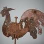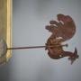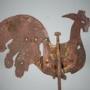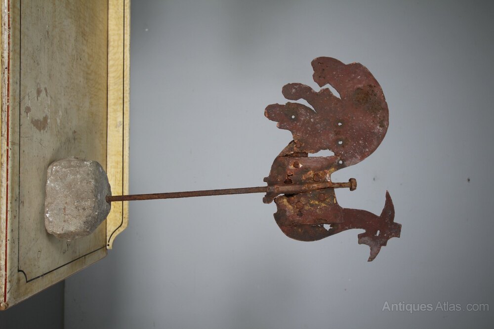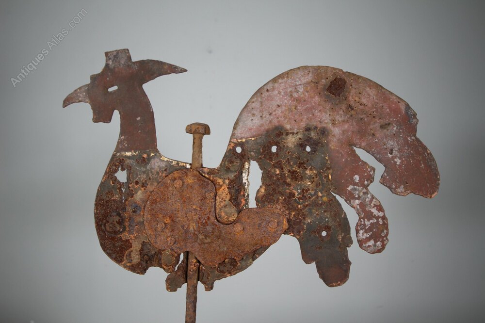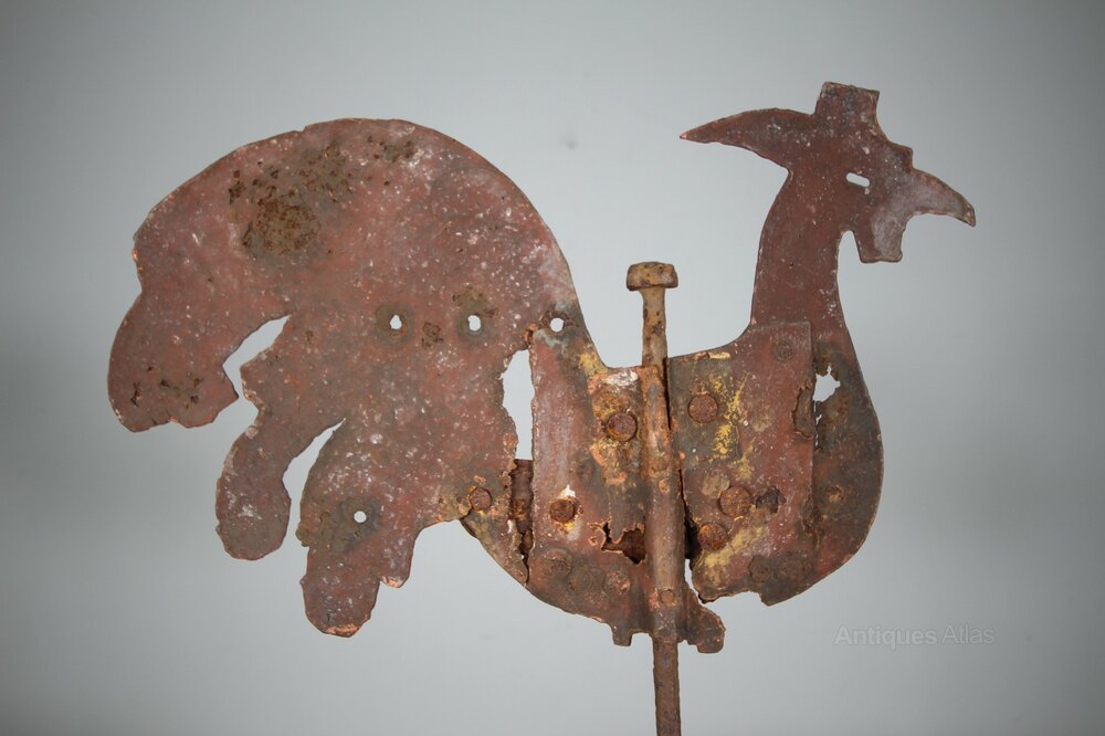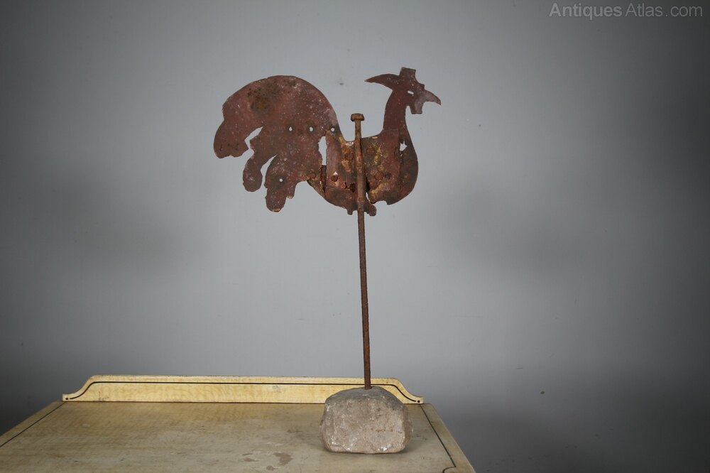 A lovely rare surviving English antique iron weathervane in the form of a Cockerel in full plumage, well weathered and with wonderful ancient repairs and displayed by being set into a large piece of stone. Has remnants of the original paint finish, a decorative piece of an antique English weathervane, quite rare to find now, this is not a reproduction. Dates to around 1850.