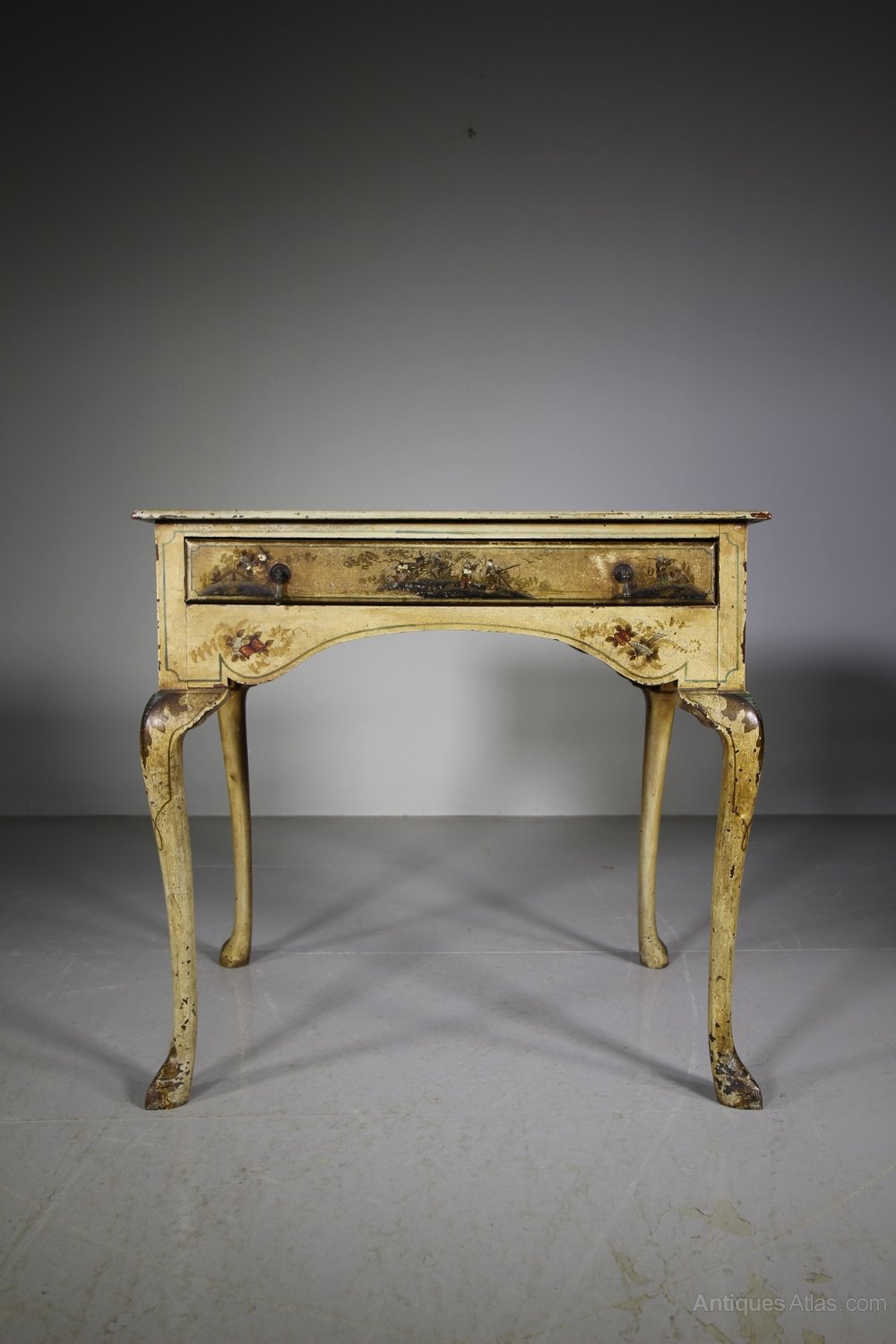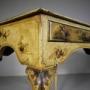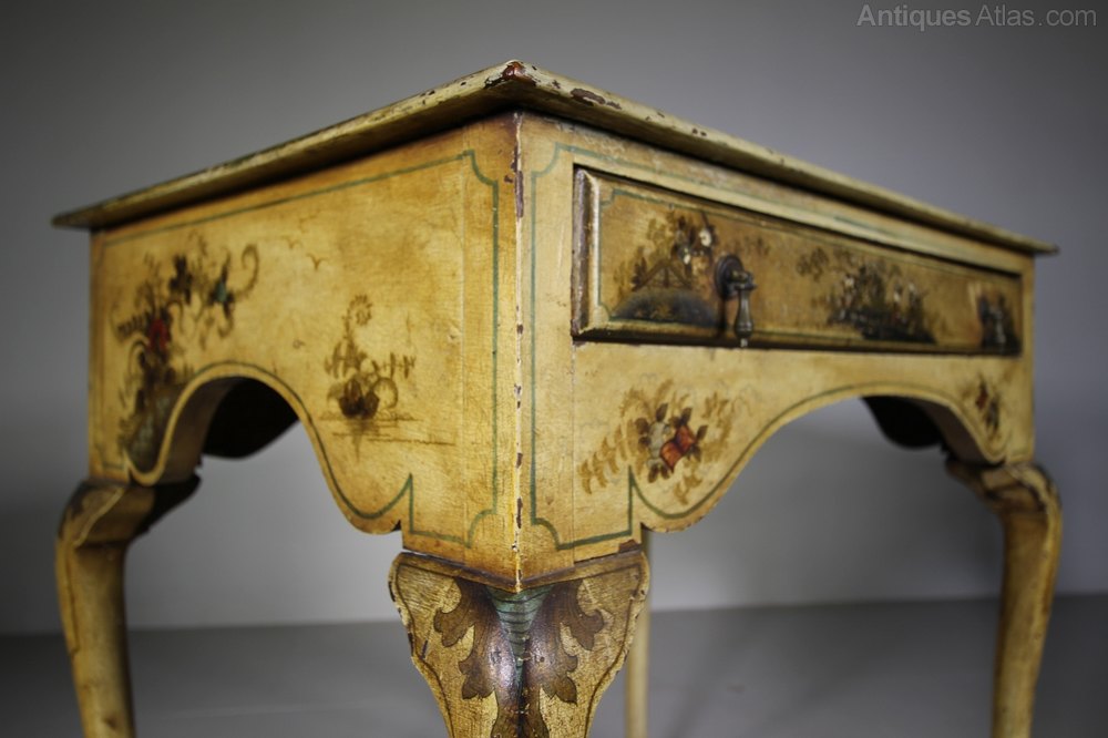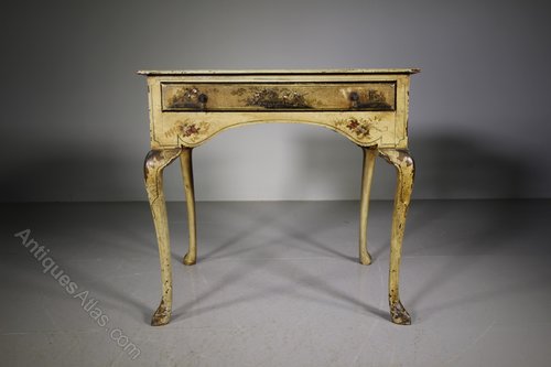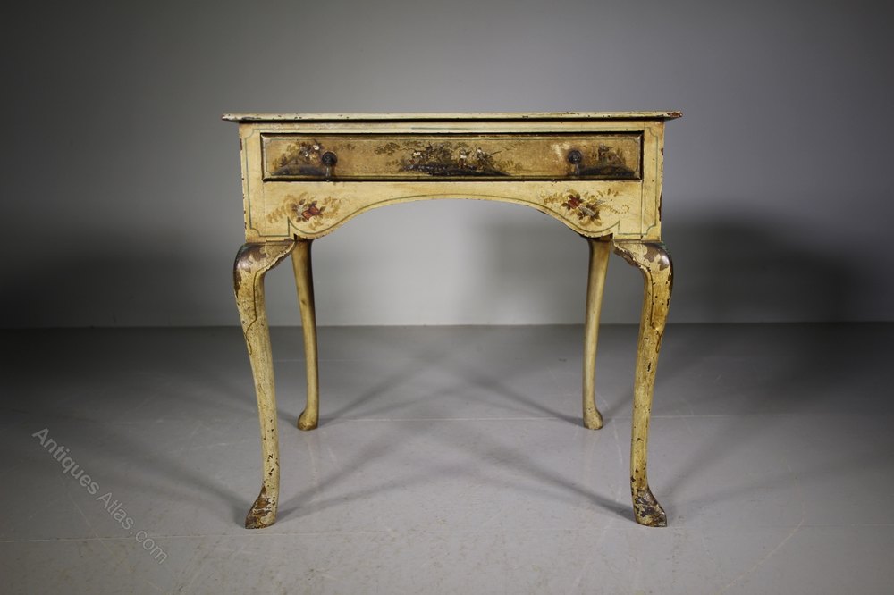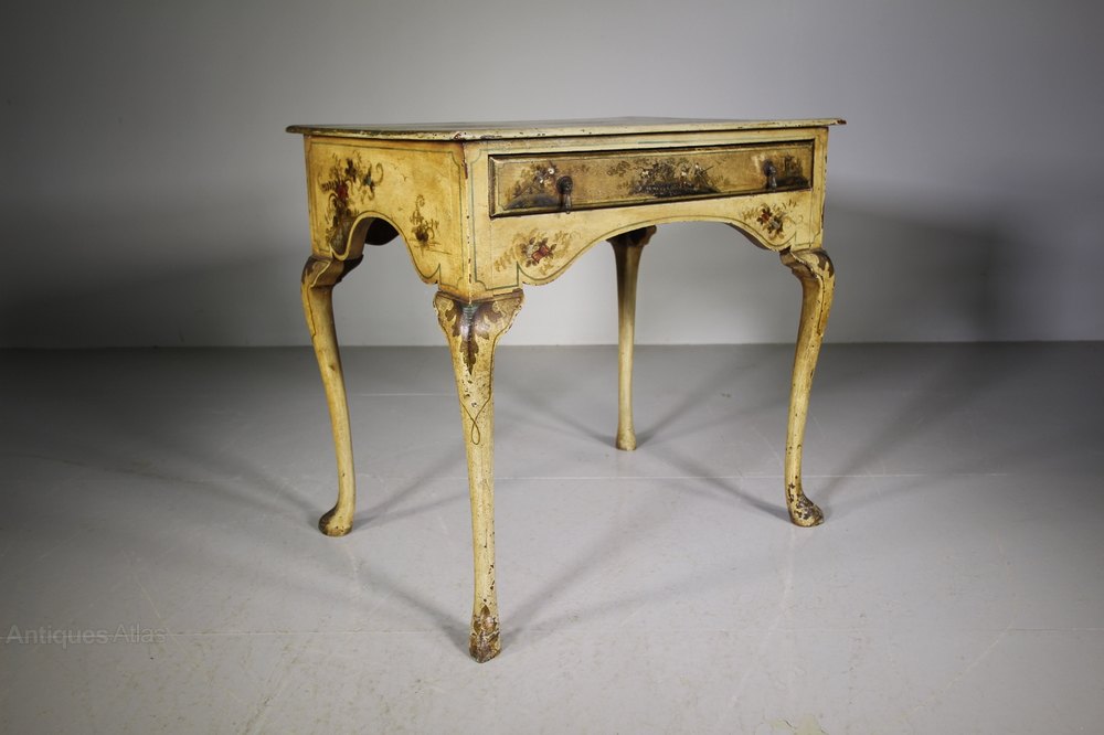 A lovely English antique low boy that has wonderful, original cream Chinoiserie decorations to every surface. The decorative 19th century antique table is in super condition, it has a single drawer to the front with a shaped apron underneath and also to the sides and it stands well on cabriole legs. Dates to around 1870.