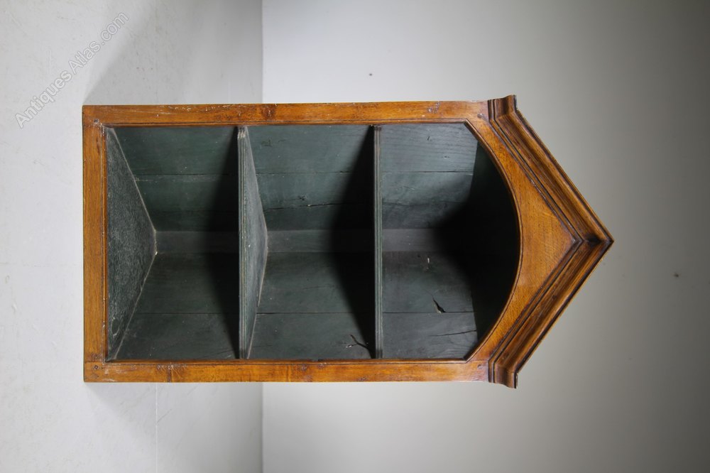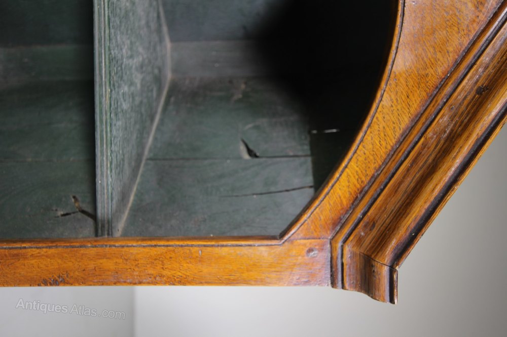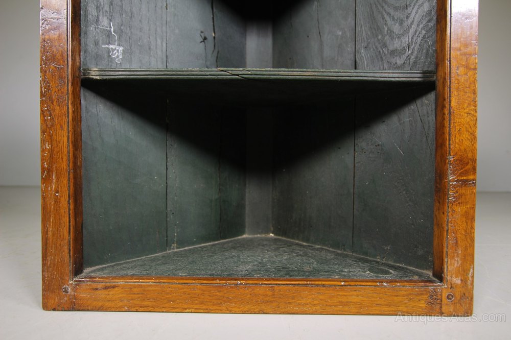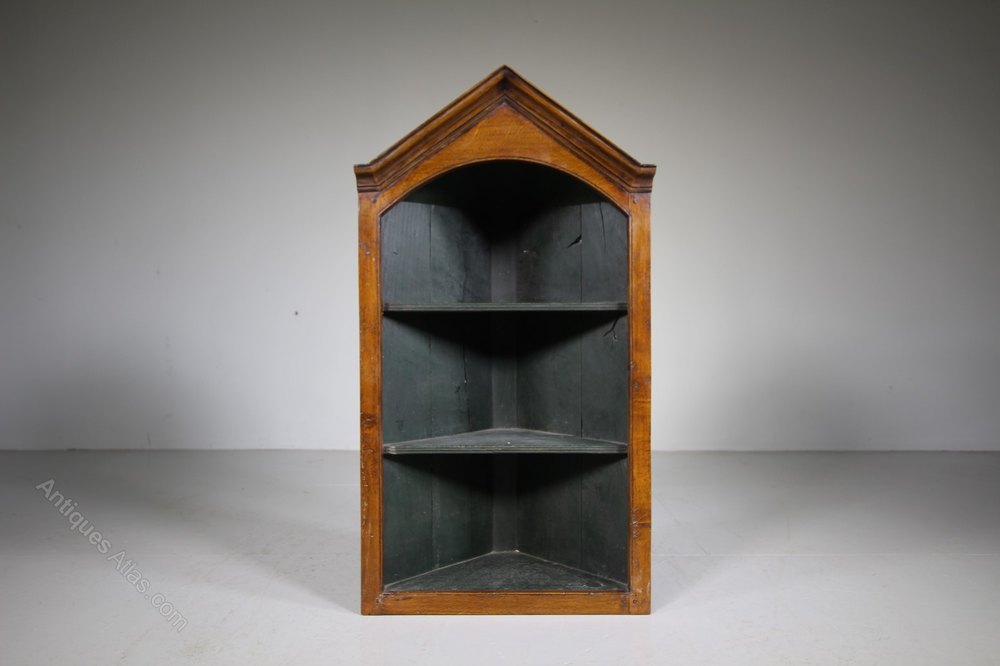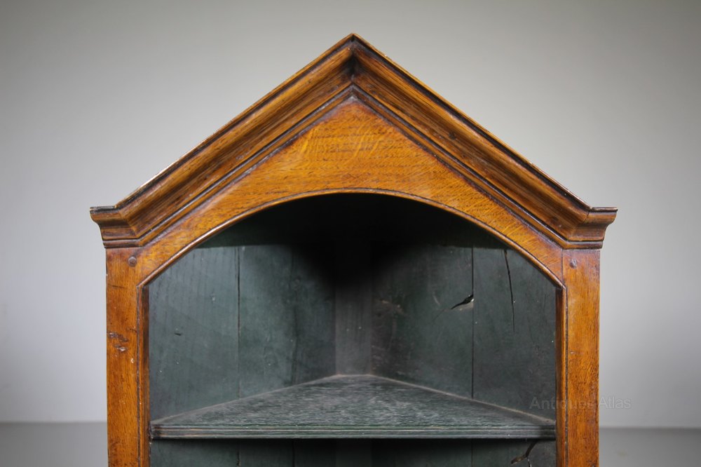 This William IV antique oak wall cupboard is open fronted, never had a door. A lovely piece made in solid oak with a arch top and with two reeded fronted shelves inside and still in the original green paint finish to the interior. In excellent condition, all pegged construction, dates to 1830.