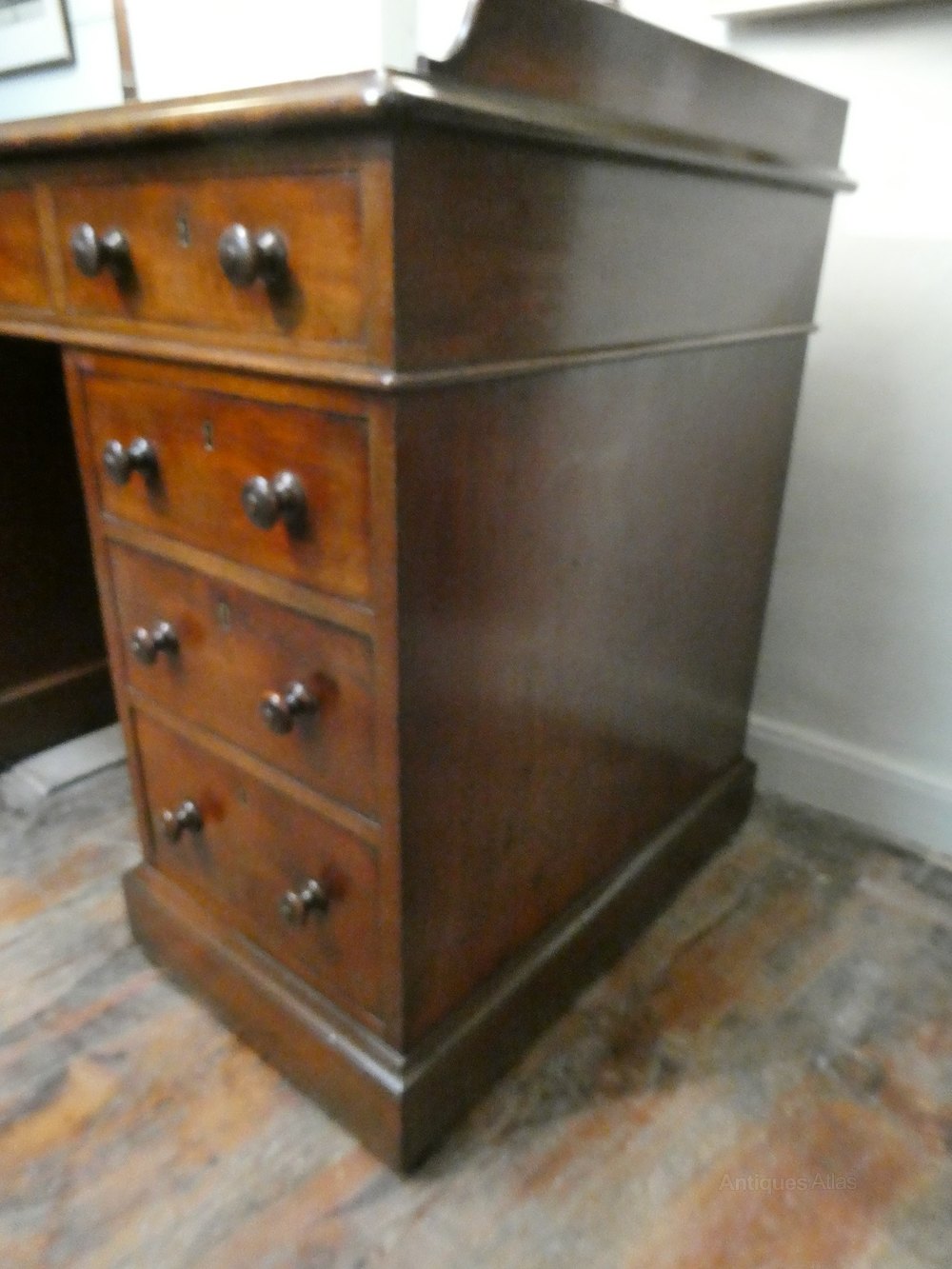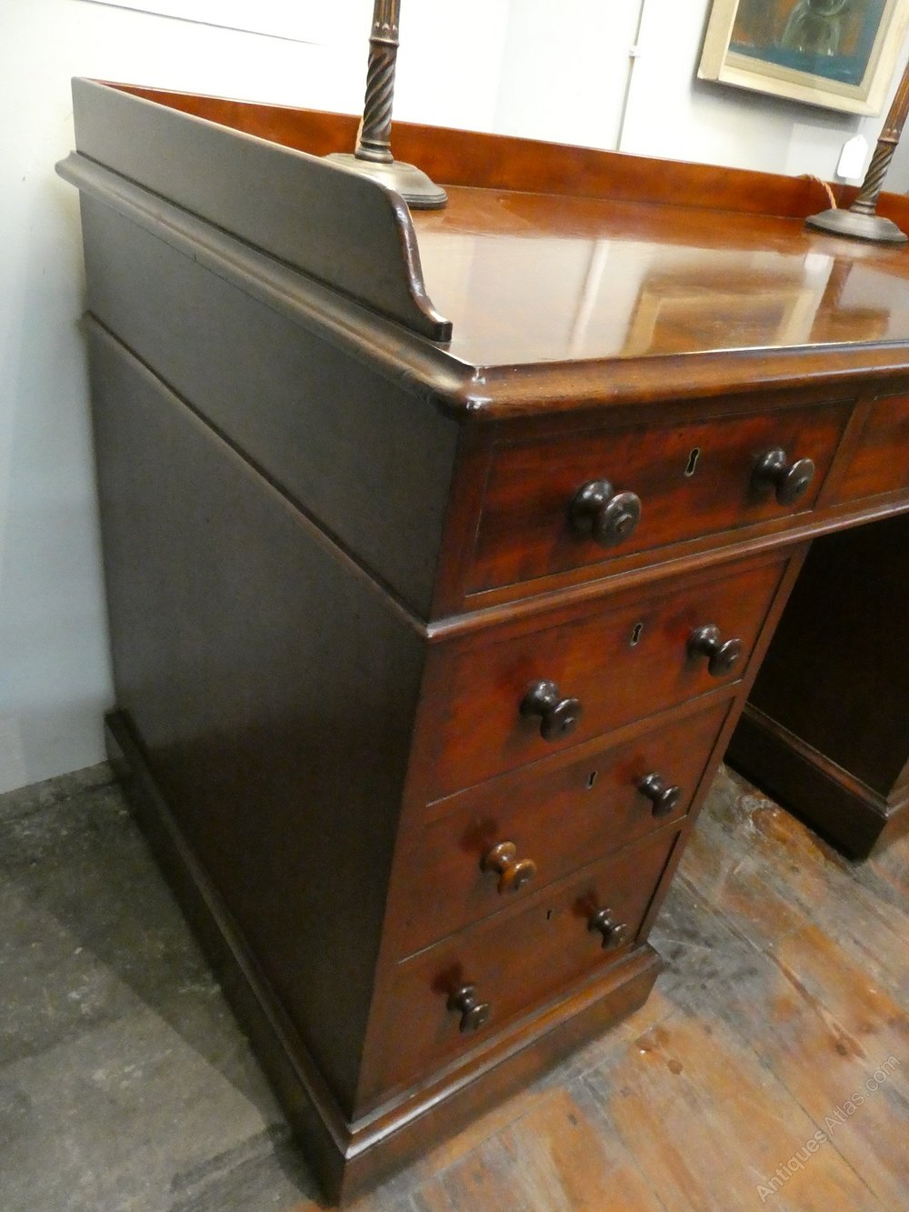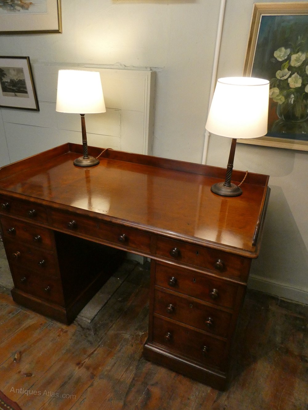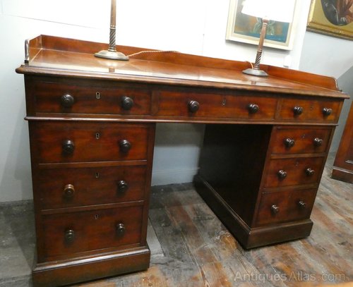 A good quality 19th century kneehole desk stamped by Holland & Son of London. The desk with mahogany lined drawers, rounded corners and turned mahogany handles, with a neat mahogany gallery.
