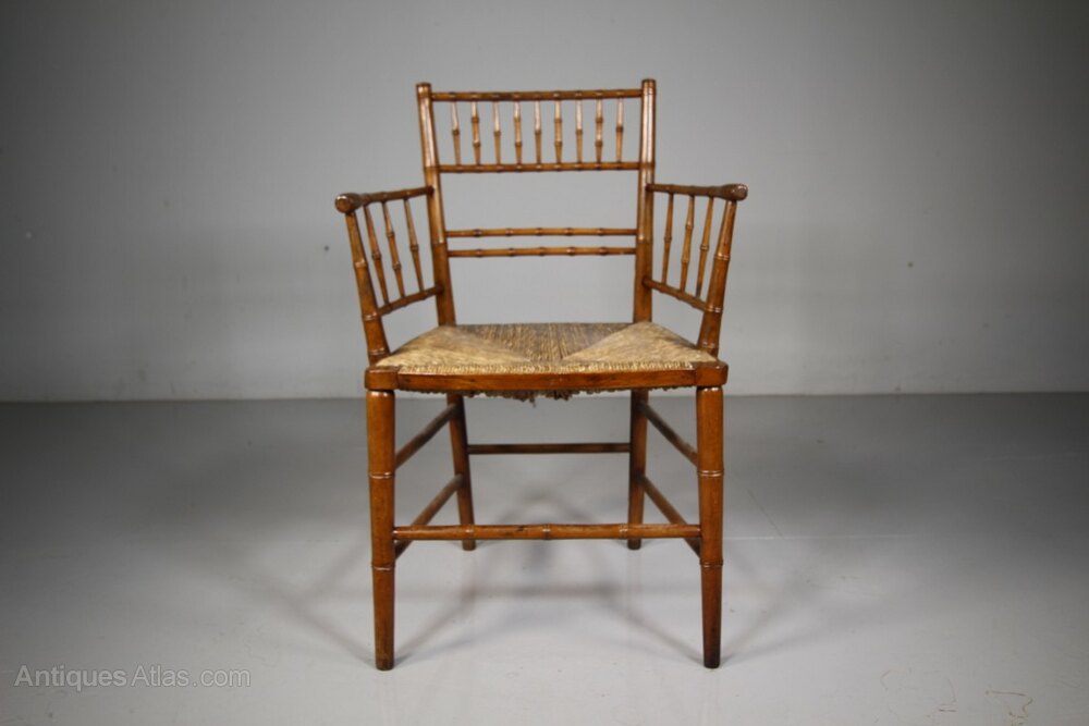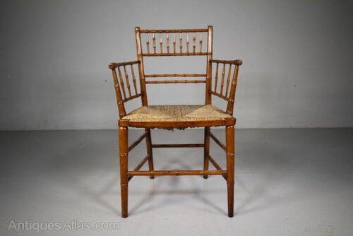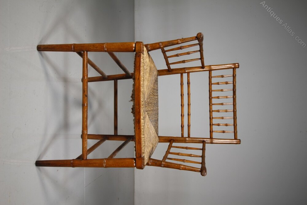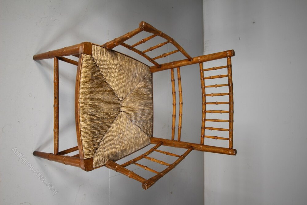 A beautiful, much finer than most, English early 19th century antique rush seated armchair with simulated bamboo spindles and turnings. In superb intact and strong condiiton and with an intact rushed seat. The seat height is 44cm. English and dating to 1815.