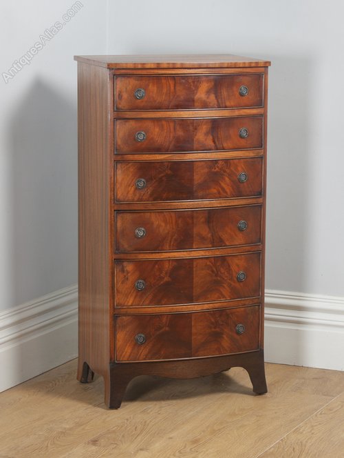 This is a good quality English Regency style flame mahogany bow fronted tallboy chest of drawers, with lovely proportions, circa 1950, in good original condition.