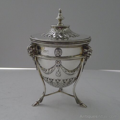 A truly exceptional Edwardian tea caddy in Adam style standing on three hoof feet and beautifully decorated with three Ram's heads, swags and Acanthus leaves.