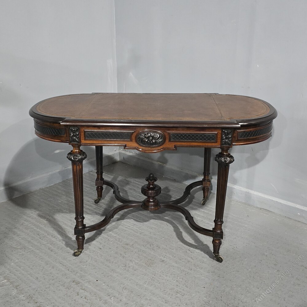 A superb quality C19th rosewood library writing table, or centre table, freestanding with full width drawer and tan coloured leather, in outstanding condition.