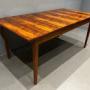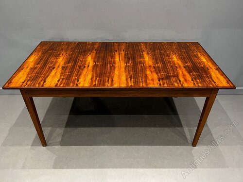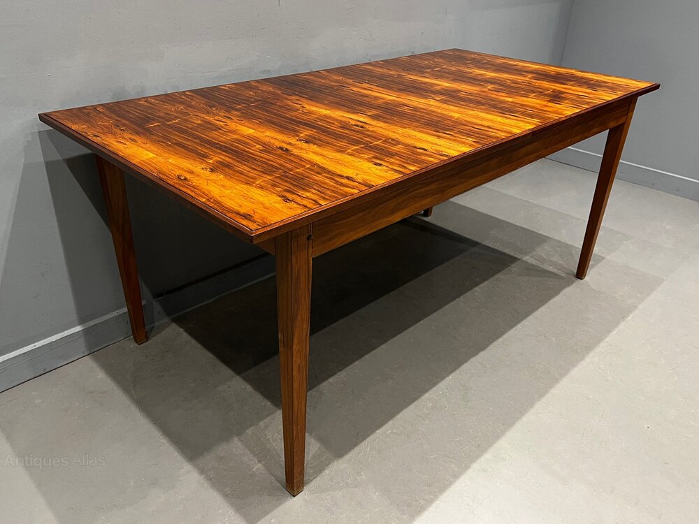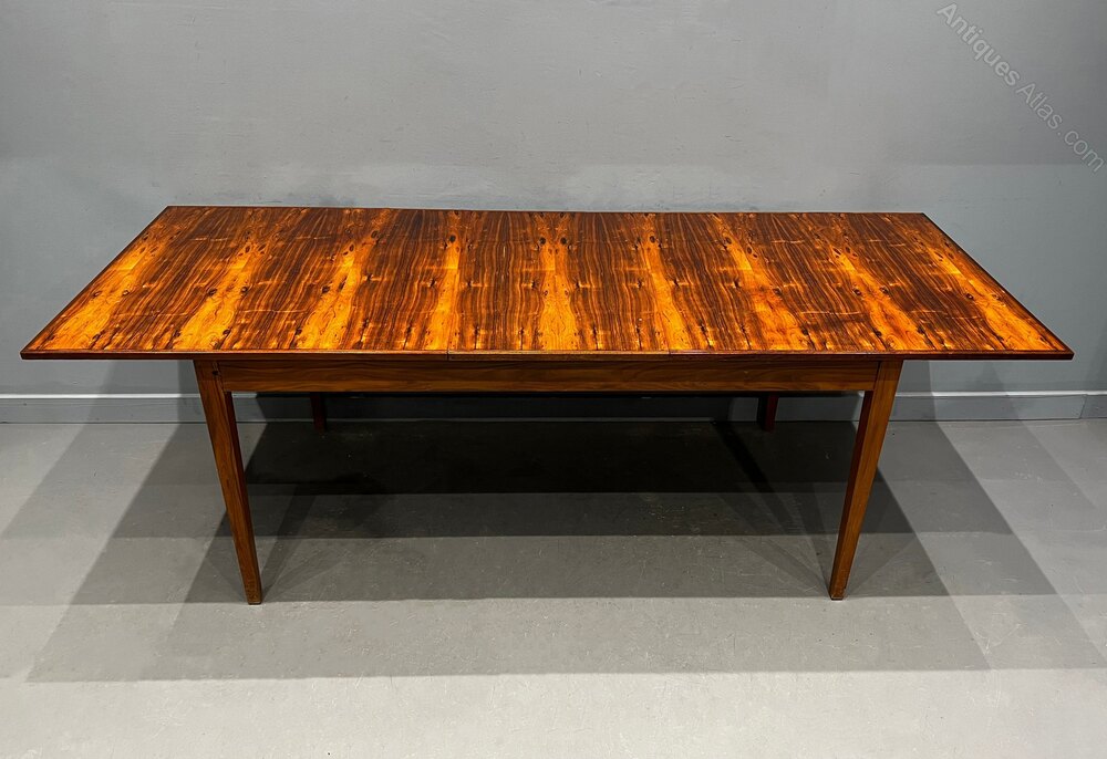 With gently tapering legs and slightly oversailing top with dark rosewood border. When extended the table comfortably seats eight people.