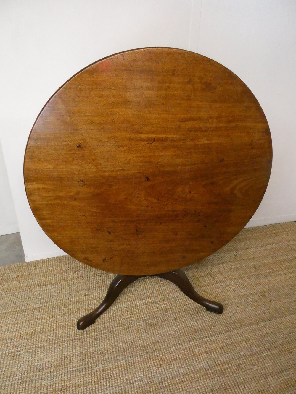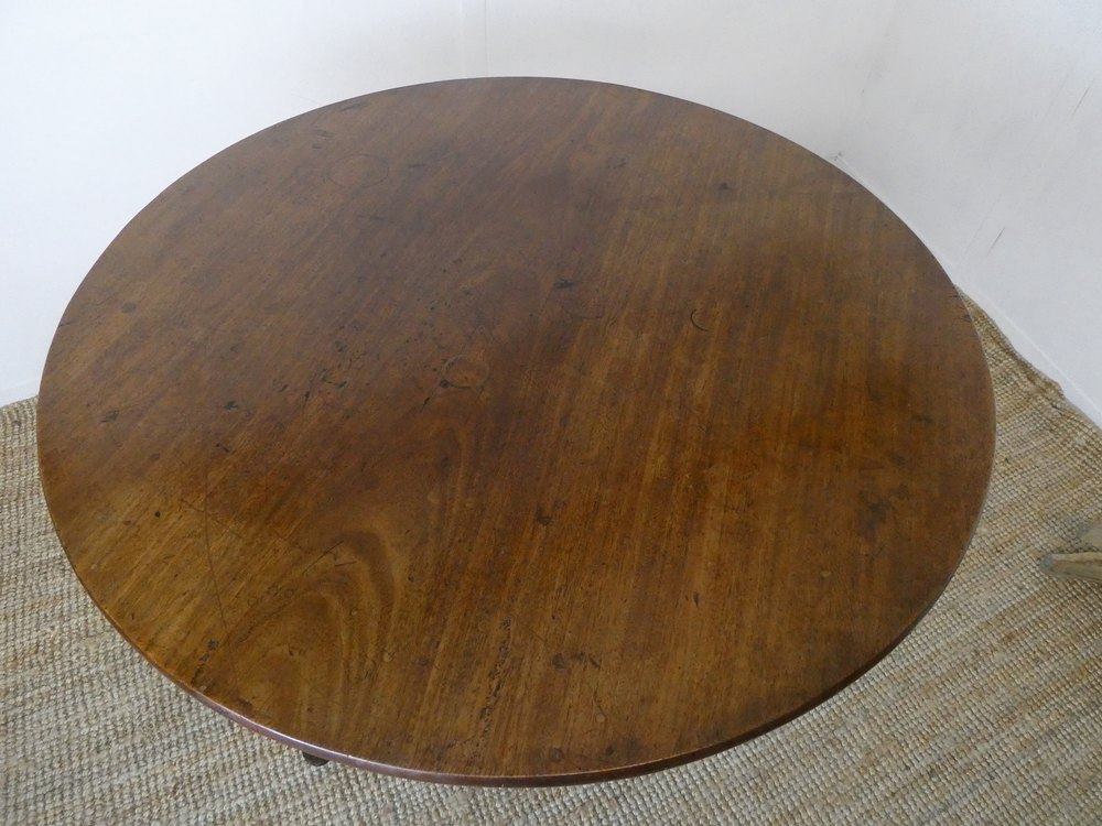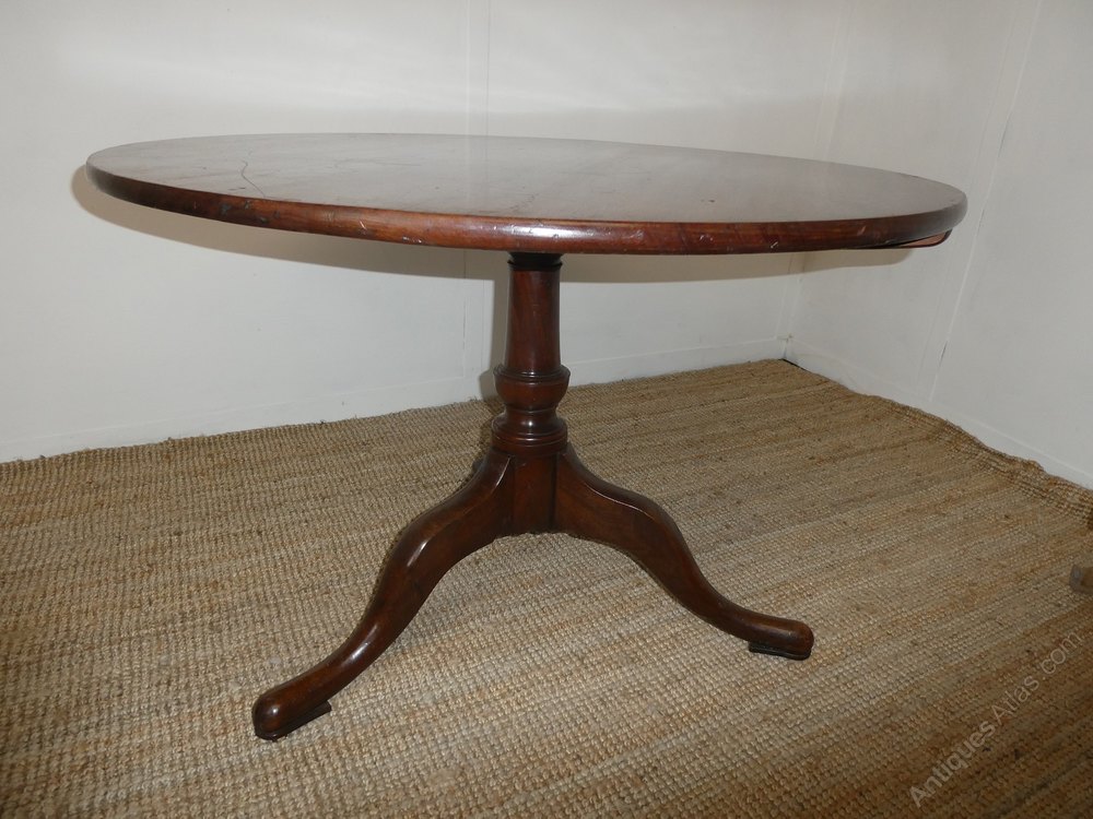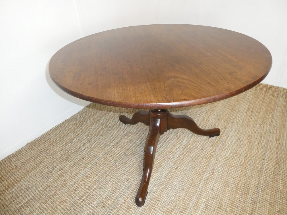 A large English 18th century mahogany tilt table. The table constructed with a one piece mahogany top, standing on a tripod cabriole base with original castors.