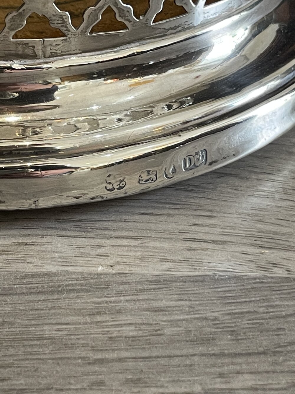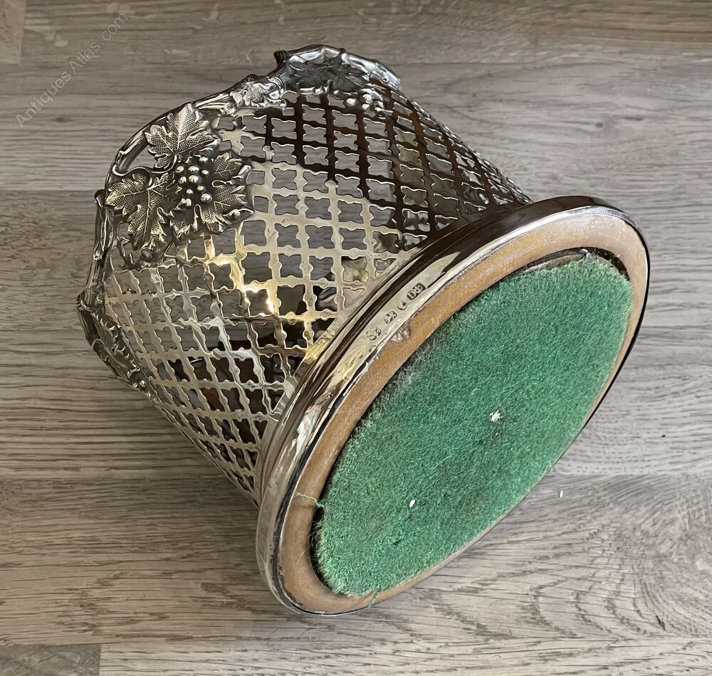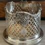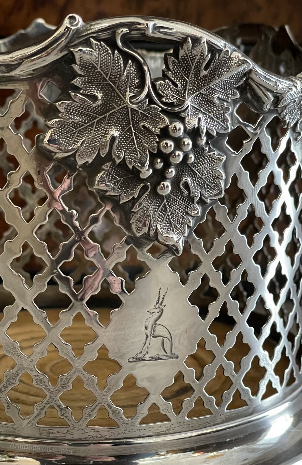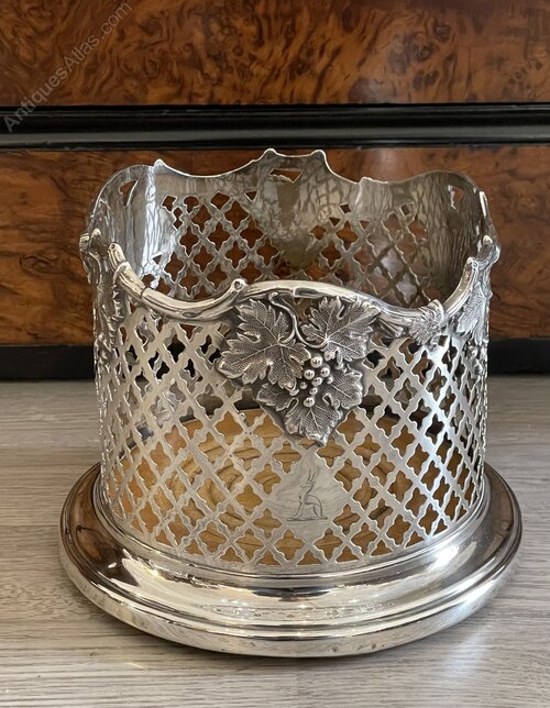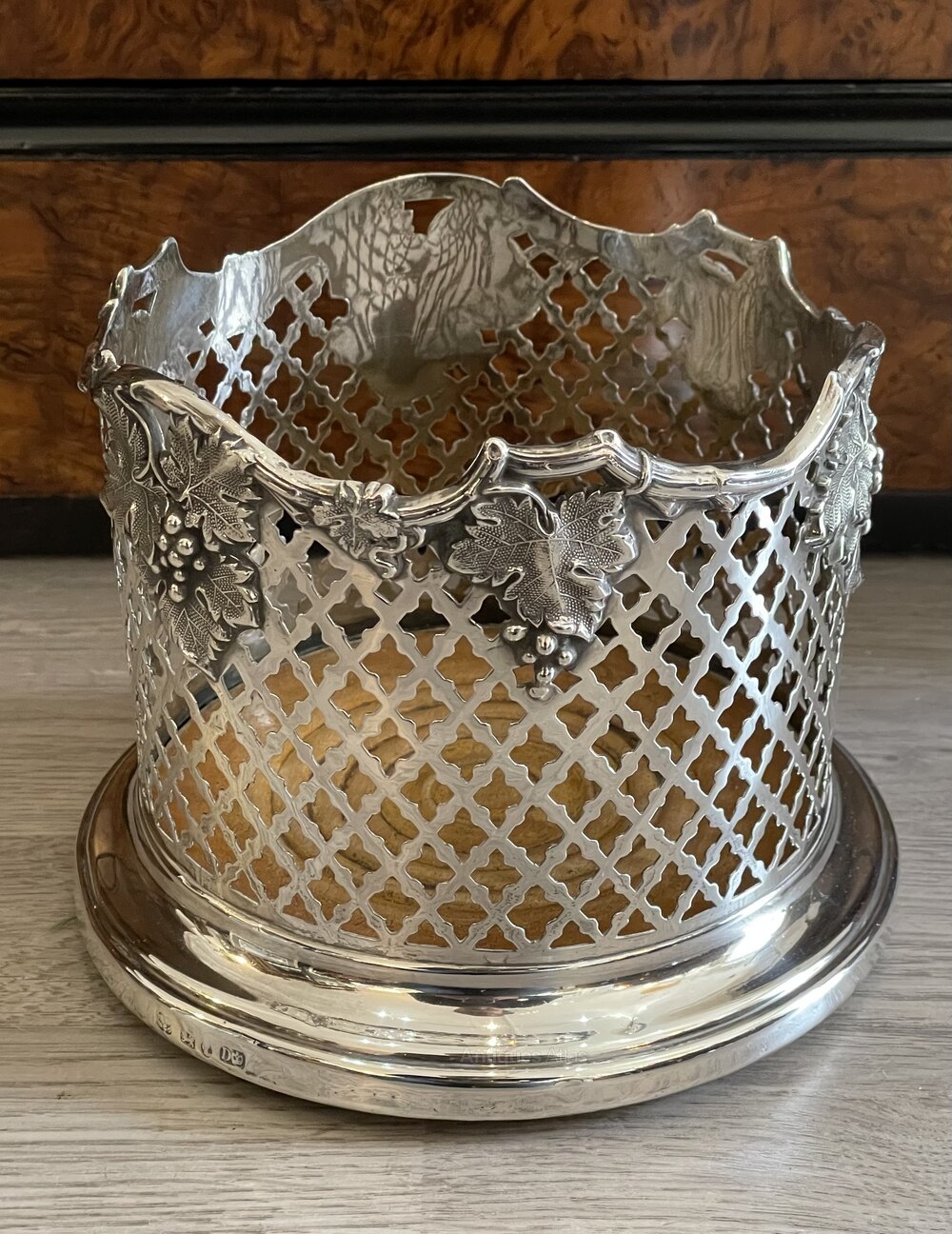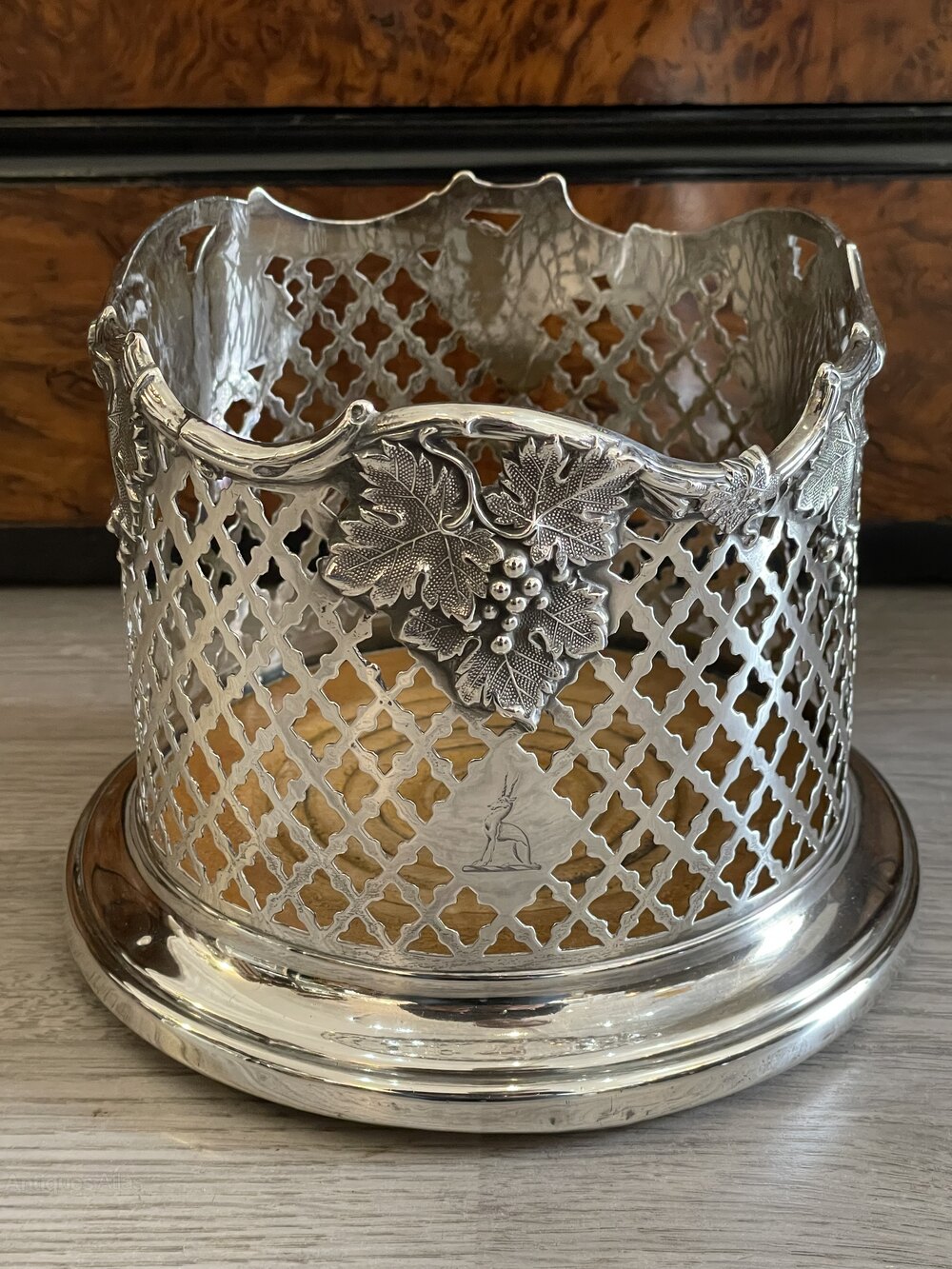A large early Victorian solid silver bottle stand/coaster, hallmarked Sheffield 1847 by Henry Wilkinson and Co. Wonderful pierced decoration with cast rim and grape vine decoration. Crested. Turned wooden coaster base with felt slide pad. A large example which would accommodate a bottle of wine or champagne.