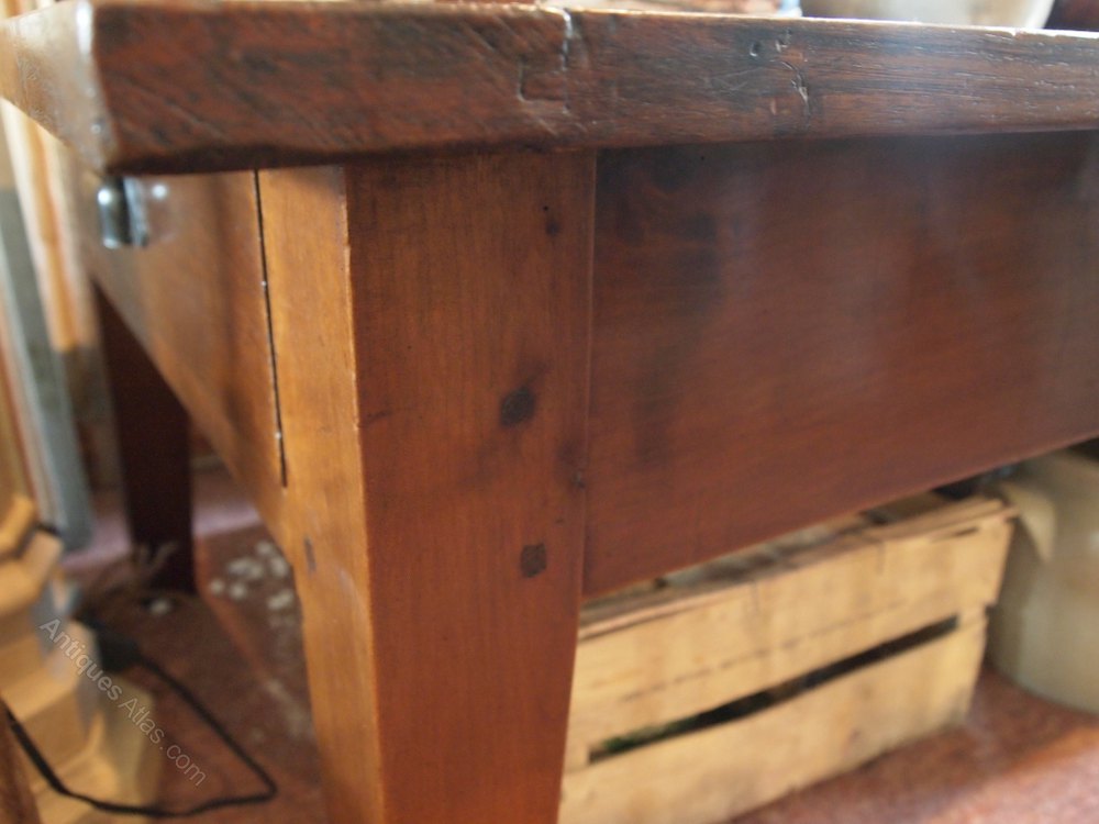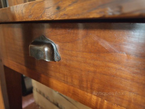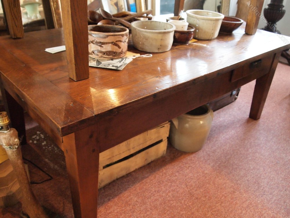 Very nice quality antique oak table with beautiful colour and patina now reduced in height. It has two drawers, a large one to the end and a small one offset to the side. A very solid and useful item.