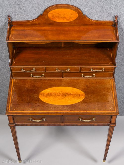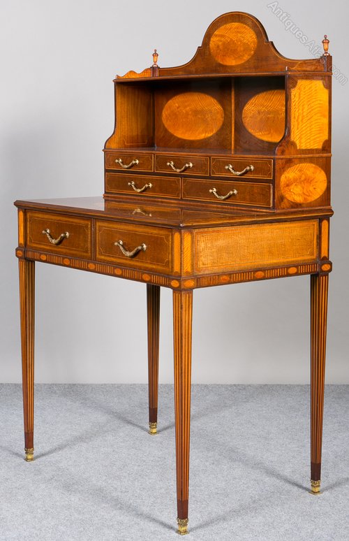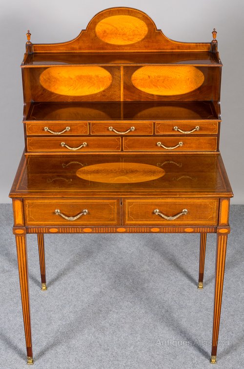 A stunning, top quality, Sheraton revival writing table from the bespoke workshops of "Edwards & Roberts". The fiddleback, figured and plum pudding mahogany, profusely inlaid with superb figured satinwood ovals. The superstructure with a shaped gallery and turned finials with an open recess and a bank of 3 over 2 boxwood inlaid drawers below. The top with a large satinwood oval and further satinwood cross banding between boxwood and ebony lines. The front with a single drawer which is inlaid to appear as 2 drawers with conforming banding and inlay. The drawer opens to reveal a writing slide which retains the original blue velvet surface and when pushed back allows access to the stationary and pen compartments. This fine piece of Sheraton revival antique furniture retains all the quality brass handles, the brass lock with 2 keys and is stamped "EDWARDS & ROBERTS" to the top of the drawer. In overall very good condition - there is slight fading and 1 or 2 bumps and bruises to the plum pudding mahogany top but all associated with age and use.