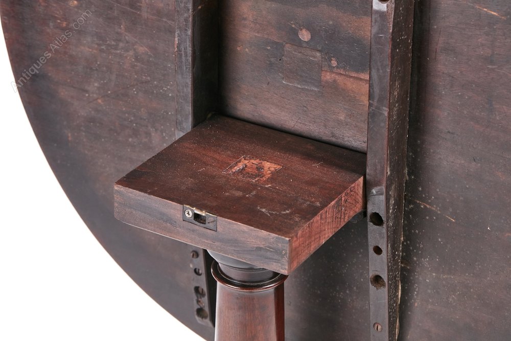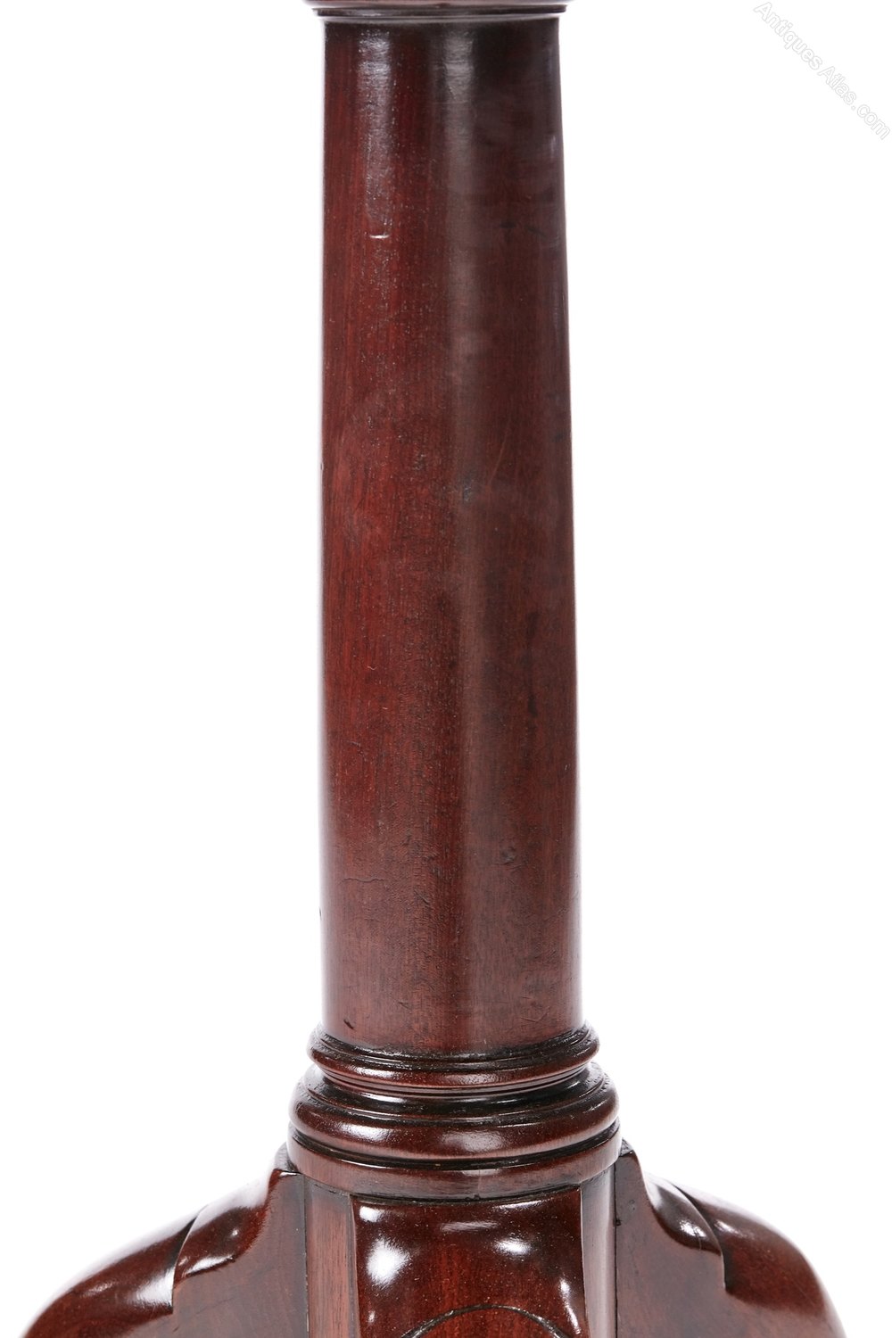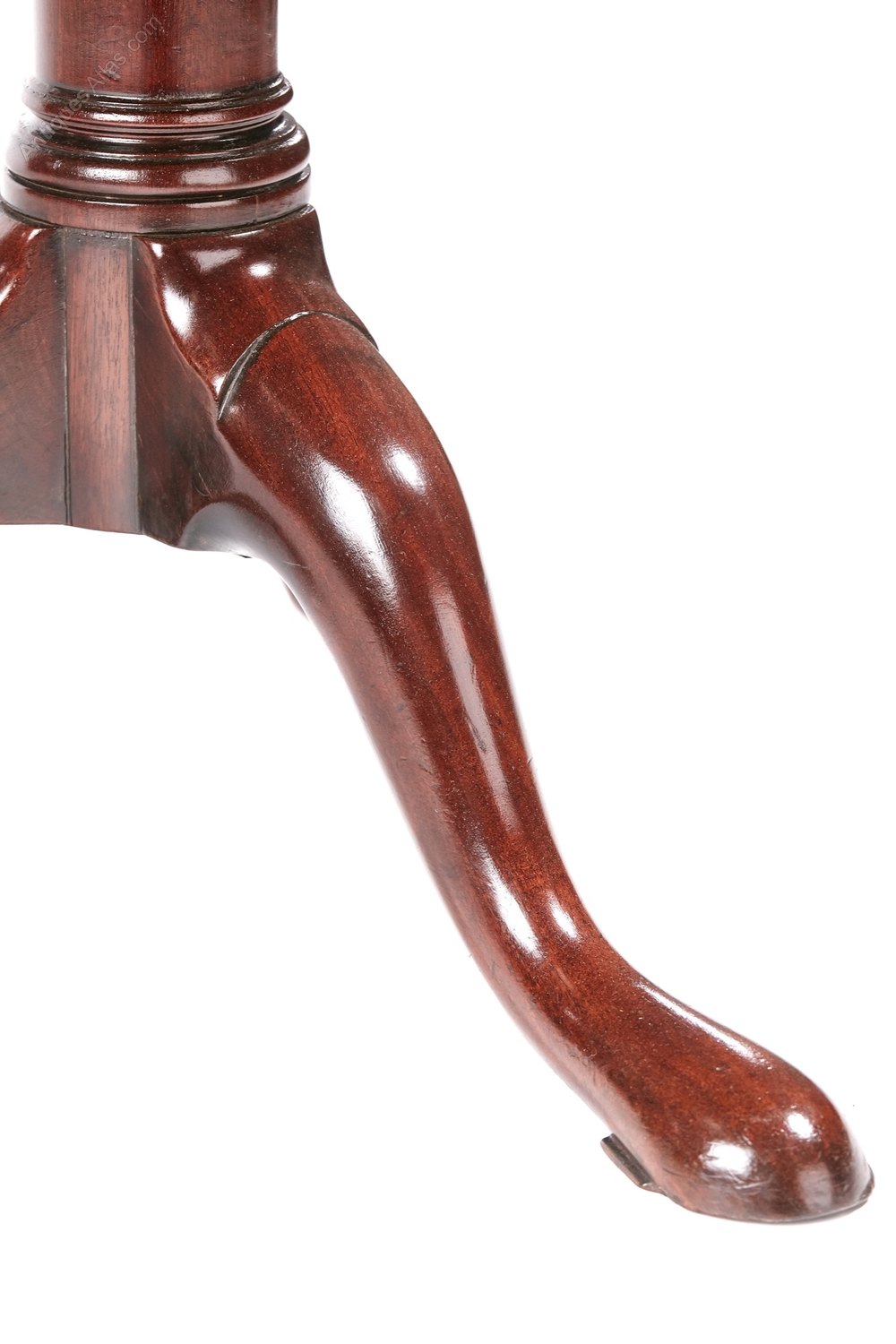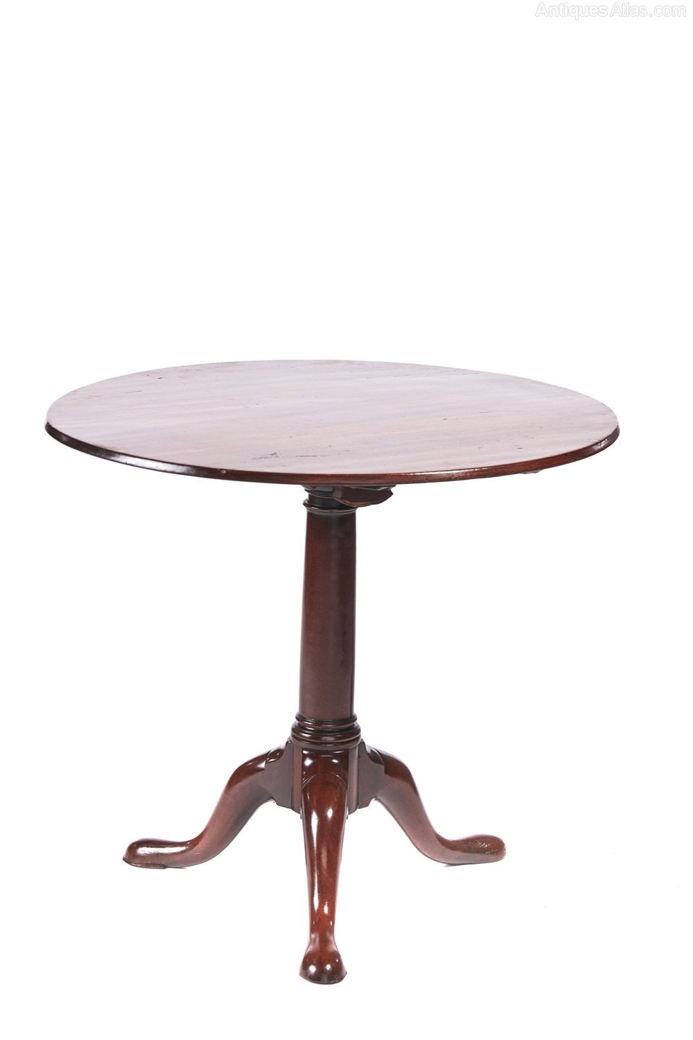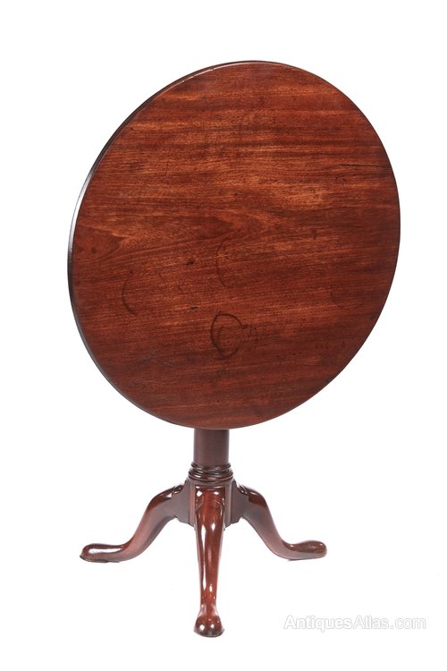 Fine George III antique mahogany wine / lamp table with a stunning mahogany round tilt top. The top is supported by an elegant turned column raised on three unusual shaped cabriole legs with pad feet.