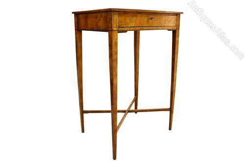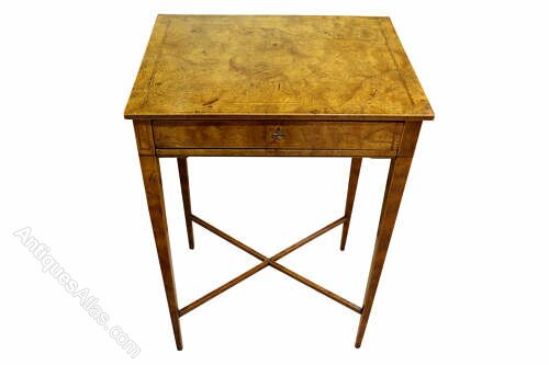 Raised on square tapering legs, also veneered in satinwood, united by a shaped crossed stretcher for added strength and refinement. The table displays excellent colour throughout, with particularly attractive figuring to the top and drawer front.