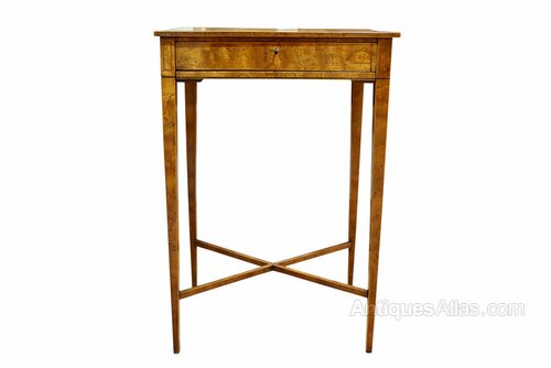 A fine and elegant George III occasional table of slender proportions, veneered in richly figured satinwood, the rectangular top finely outlined with delicate boxwood stringing. The frieze fitted with a single drawer and working lock.
