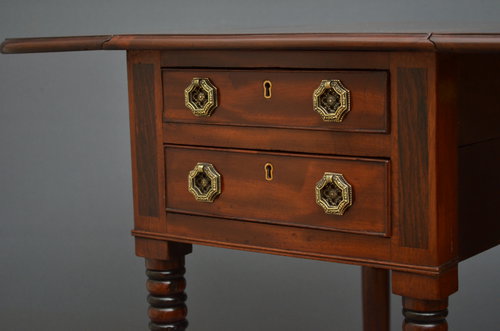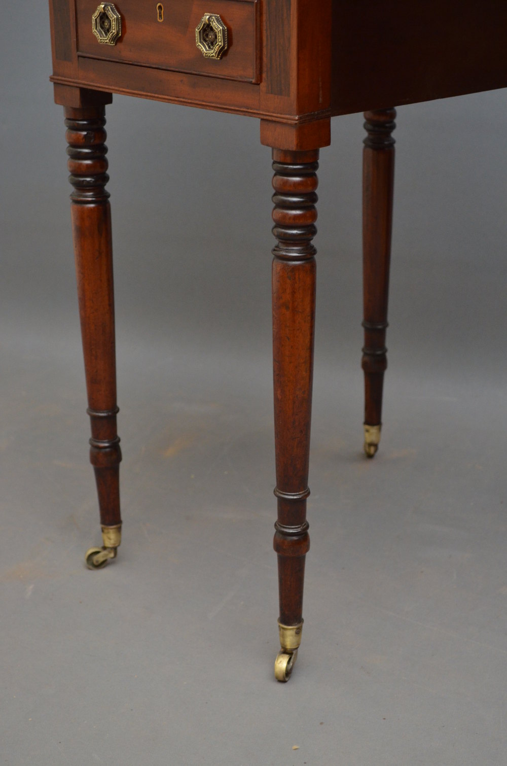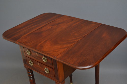 Sn3375 Fine Georgian, mahogany drop leaf Pembroke table, having moulded top above 2 cockbeaded drawers and 2 dummy drawers to opposite side fitted with attractive brass handle and flanked by inlaid panels, all standing on elegant turned and ringed legs terminating in original brass castors. This table retains its original finish with some repolishing, all in fantastic condition throughout, ready to place at home. c1810