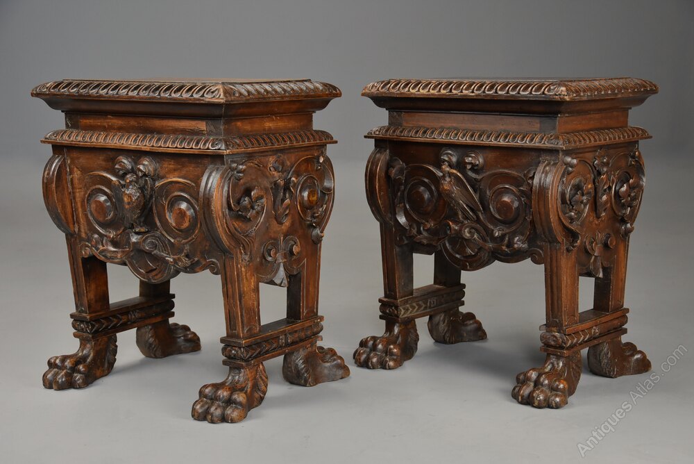 The stools are supported on tapered legs with carved moulding below, terminating on bold carved hairy paw feet.