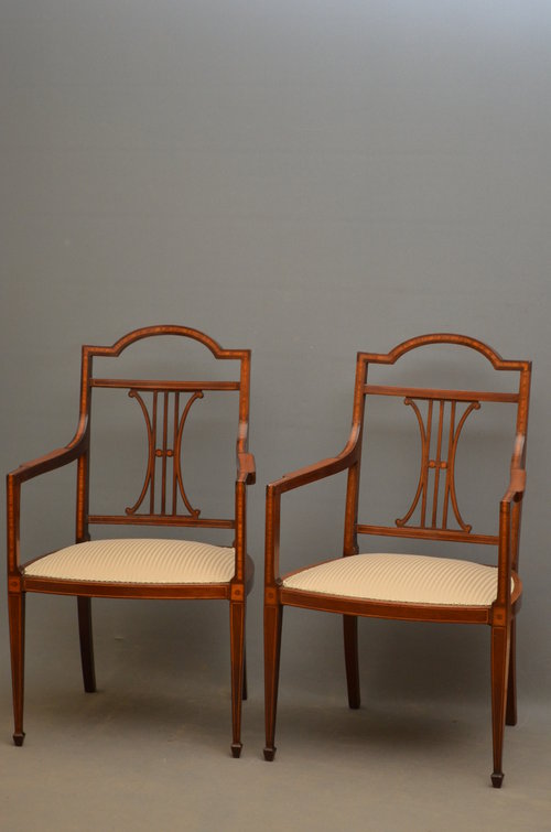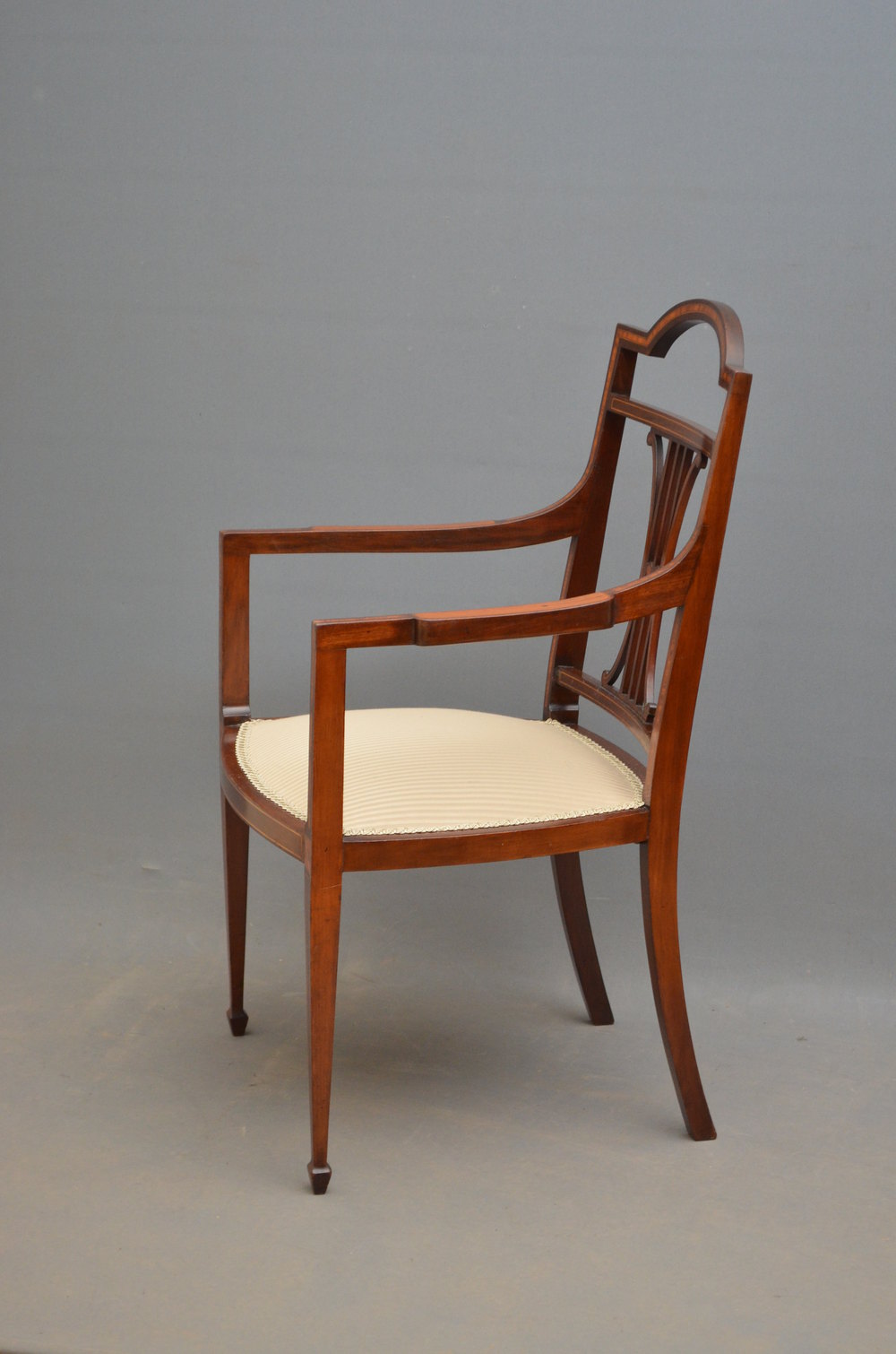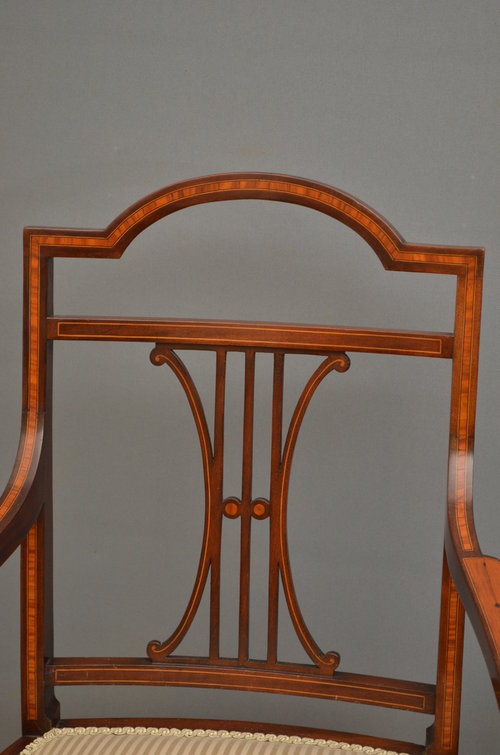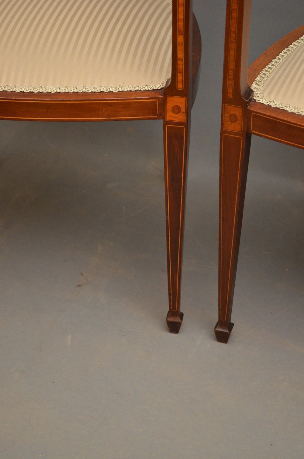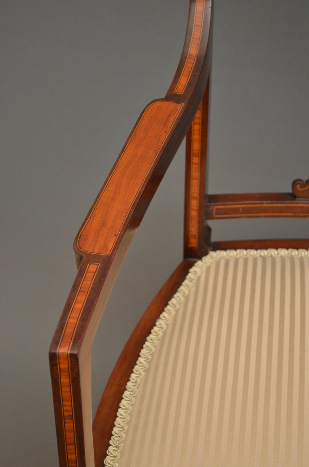 Sn3516 Fine pair of Edwardian inlaid armchairs in mahogany, having satinwood crossbanded, arched backs with shaped splats, crossbanded arms on satinwood crossbanded supports, fully upholstered seats and inlaid front rails, all standing on elegant string inlaid legs terminating in spade feet. These chairs are in wonderful original condition throughout with recovered seats. c1900