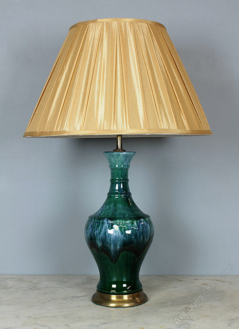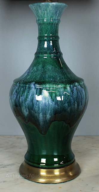 Fine pair of vintage green or blue porcelain table lamps c.1960. Elegant vase shape with a slip glaze on a brass base. Excellent condition, rewired and sold together with a PAT test certificate.