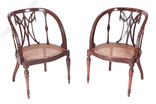 Fine pair of antique mahogany hepplewhite style library chairs,with attractive carved backs,lovely carved shaped arms,bergere seats,reeded serpentine front rail,standing on fine carved turned legs to the front outswept back legs