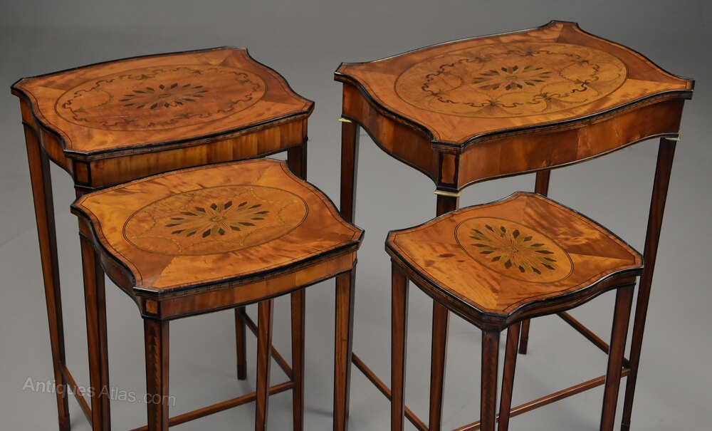 An elegant fine quality Edwardian (circa 1910) Quartetto nest of inlaid satinwood tables of serpentine form and in the Sheraton style.