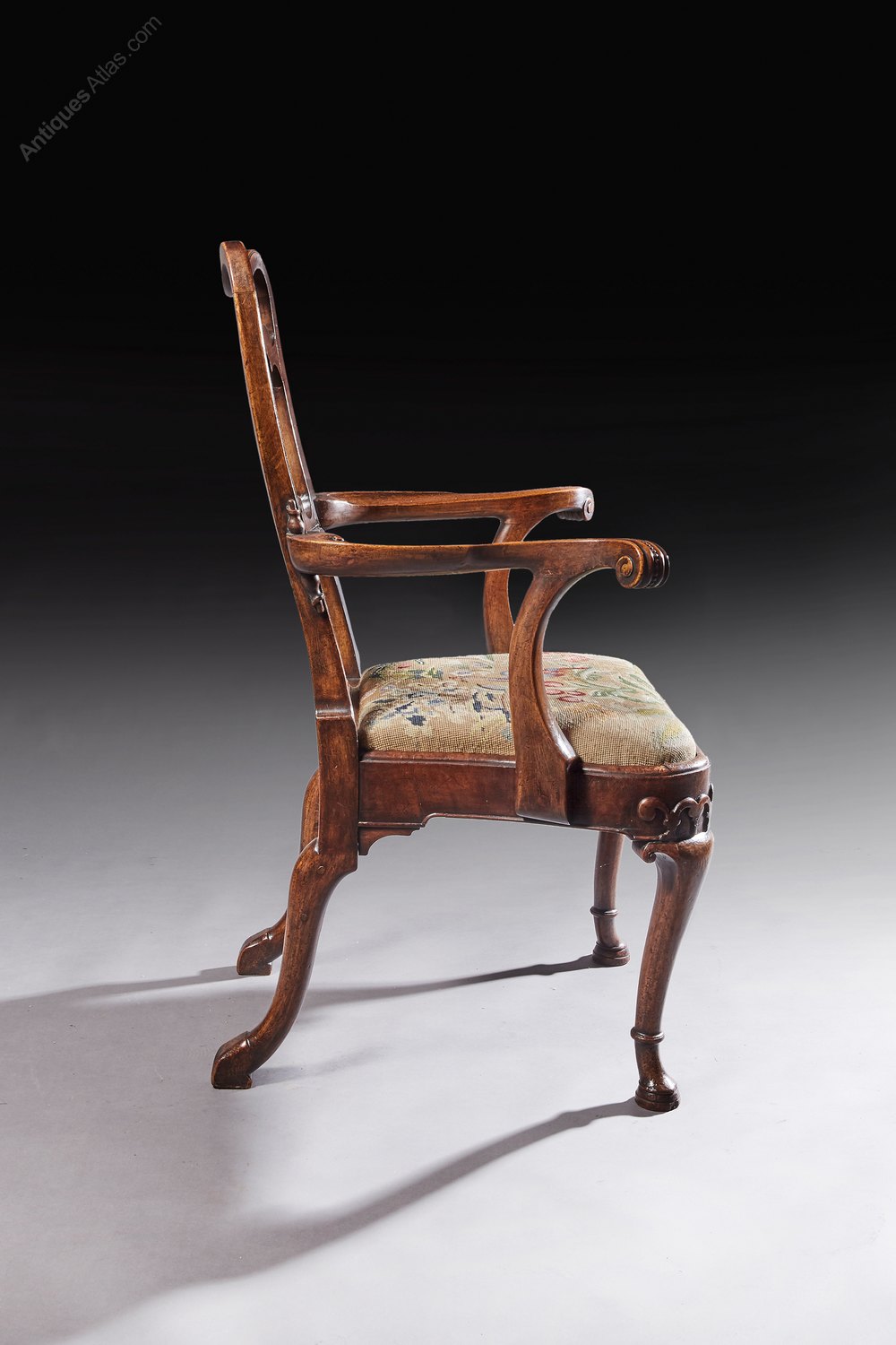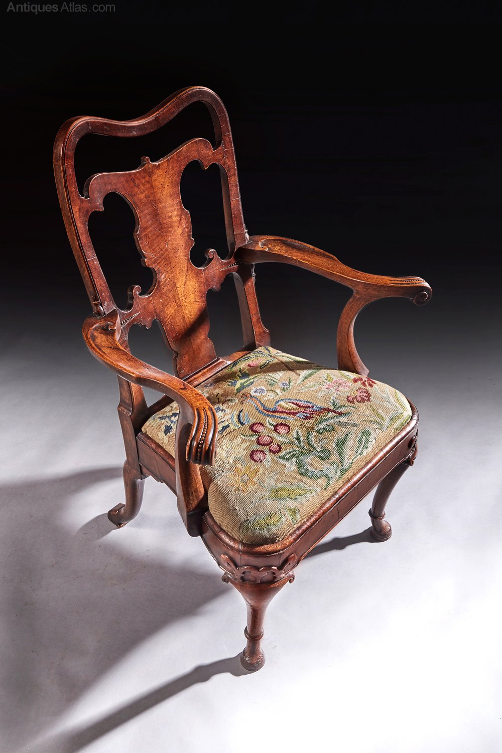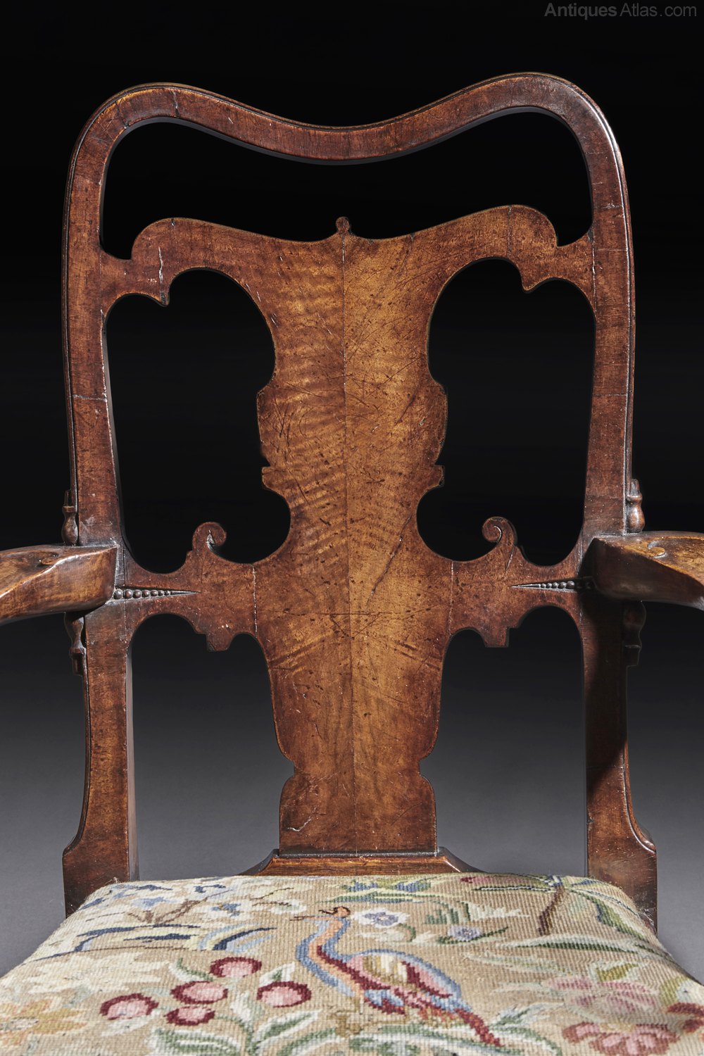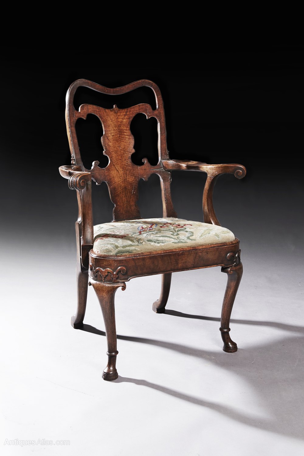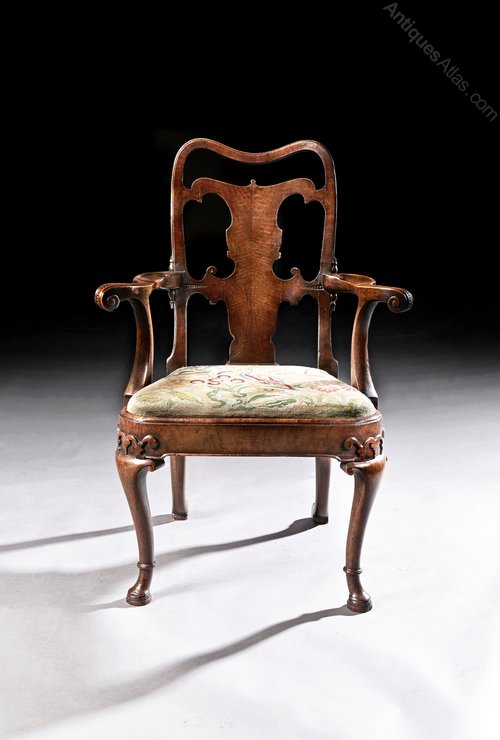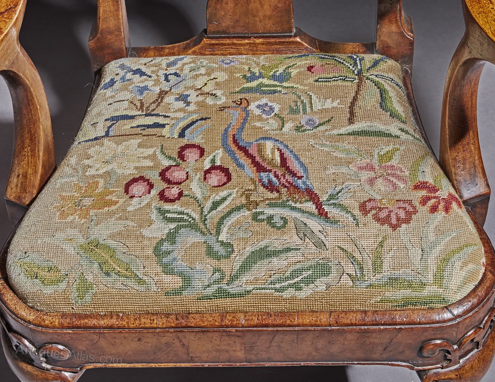 The back being veneered with choice cut thick walnut veneers whist the shaped shepherds crook arms of solid walnut with carved detail to knuckles. Retaining its original needlepoint drop in squab seat enclosed by a moulded rail with raised carvings above each cabriole front legs terminating on a hoof foot.