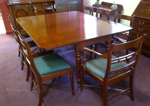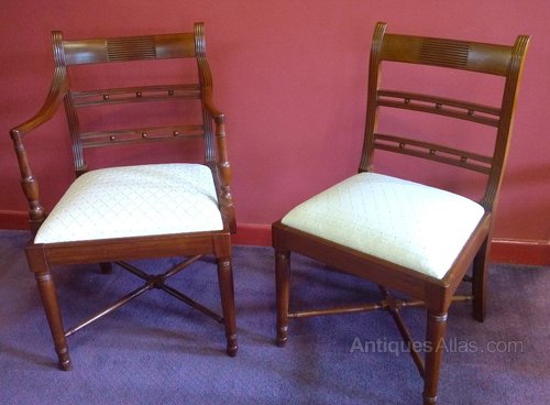 These certainly are a lovely fine set of Mahogany chairs from the early 1800s. This Regency set of eight chairs, six stand chairs and two carvers are all in really clean condition and ready to grace their new home. Well above average quality, even the seat frames are in hardwood. These chairs have a cross stretcher between all four legs to add strangth to the frames and even a further one between the back legs. The turned rails on these chairs are fine and offer good detail. A superb set with good colour. The price includes the reupholstery of the seats which will need about 2.5m of fabric of your own choice to fully complete the set. We have antique tables to go with these chairs, not least the fine example they are currently around, they make a superb set. We have other choices too so always worth a visit, we open every Friday and Saturday and other days by appointment with pleasure.