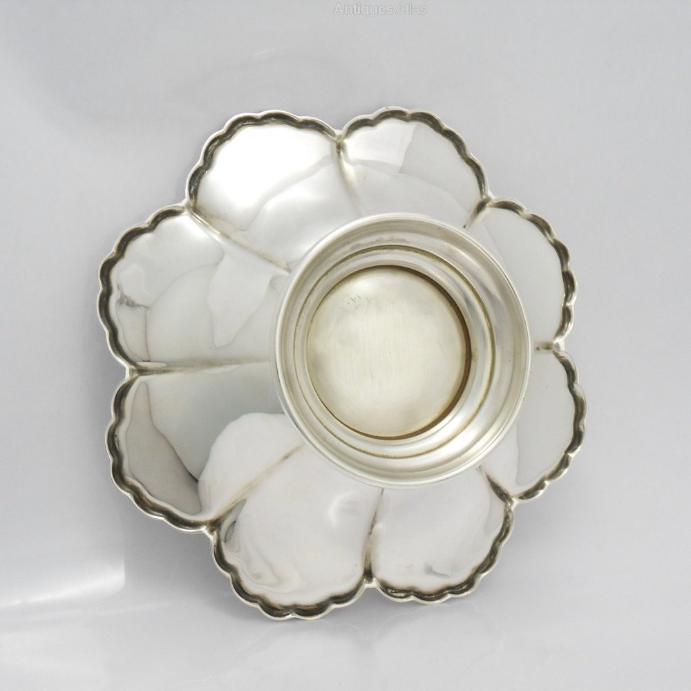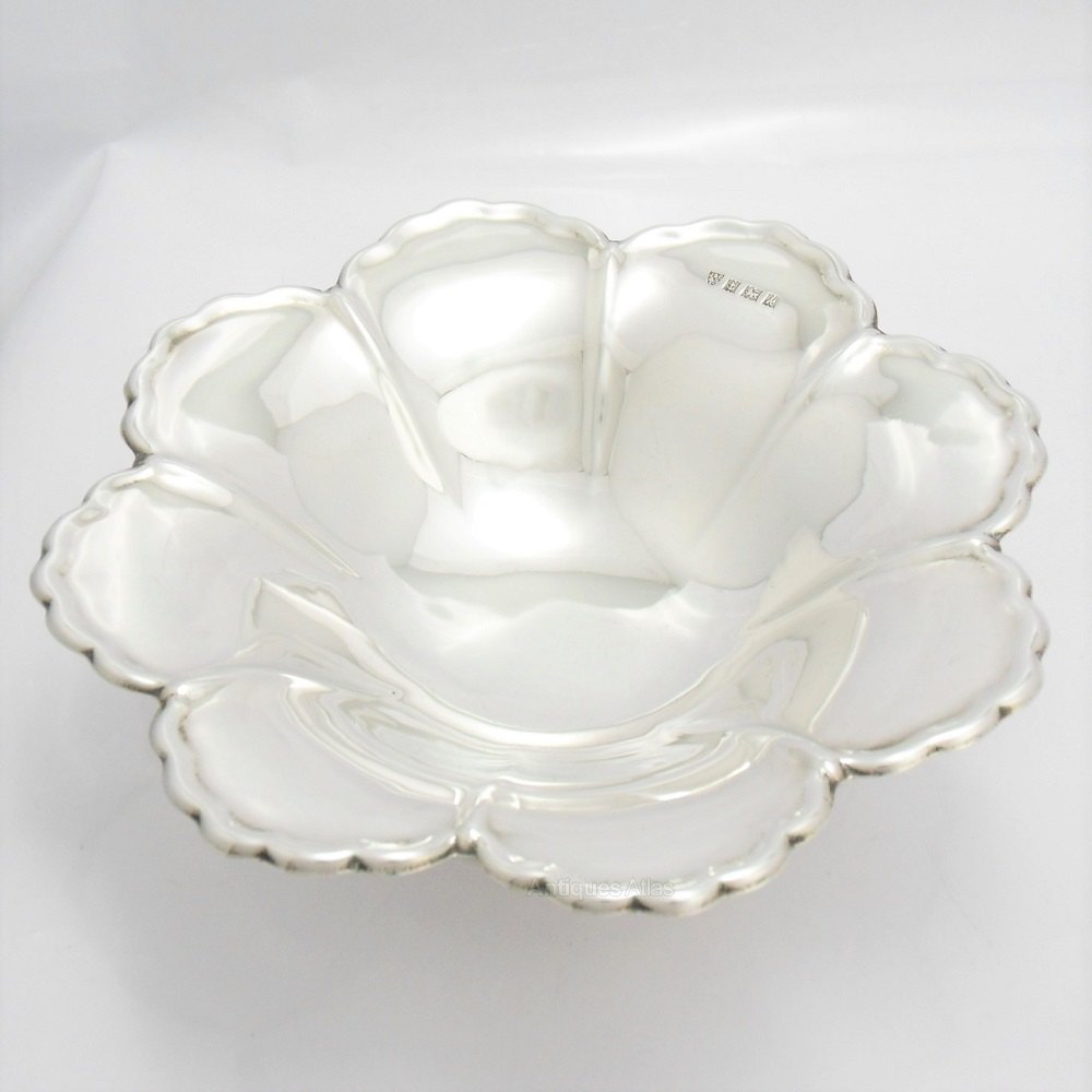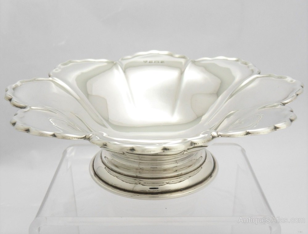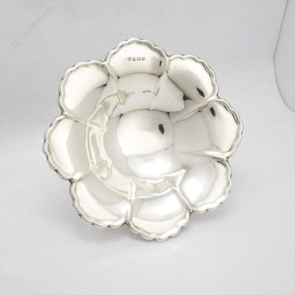 A really unusual and quite beautiful vintage, silver dish, in a plain polished silver. The dish emulates a stylized flower and sits on a single circular base. The edges of the dish protrude slightly to emphasise the 'flower' effect. The proportions are just right! Clear, crisp hallmarks are visible on the dish for the Birmingham Assay Office with a date mark for 1966, along with the Lion Passant indicating the finest sterling silver and the maker's mark: Chatterley & Sons.