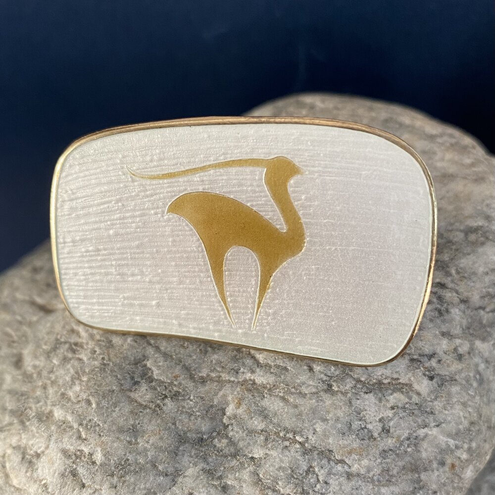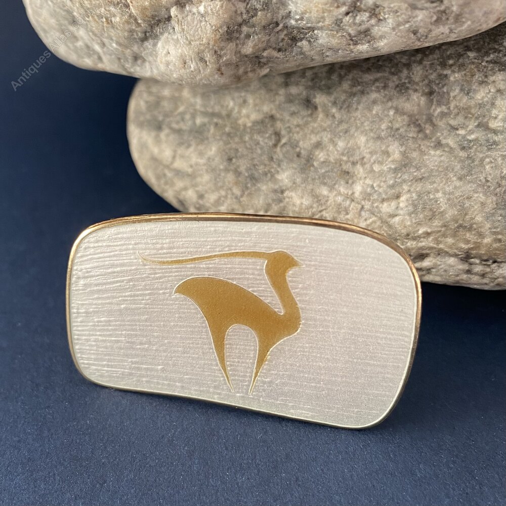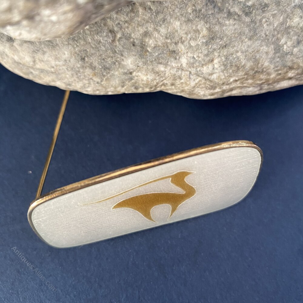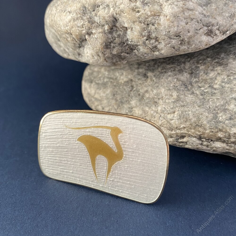 A very pretty mid century Norwegian silver and enamel brooch by Finn Jensen. The brooch has an ivory textured background featuring a golden Gazelle. In very good vintage condition.