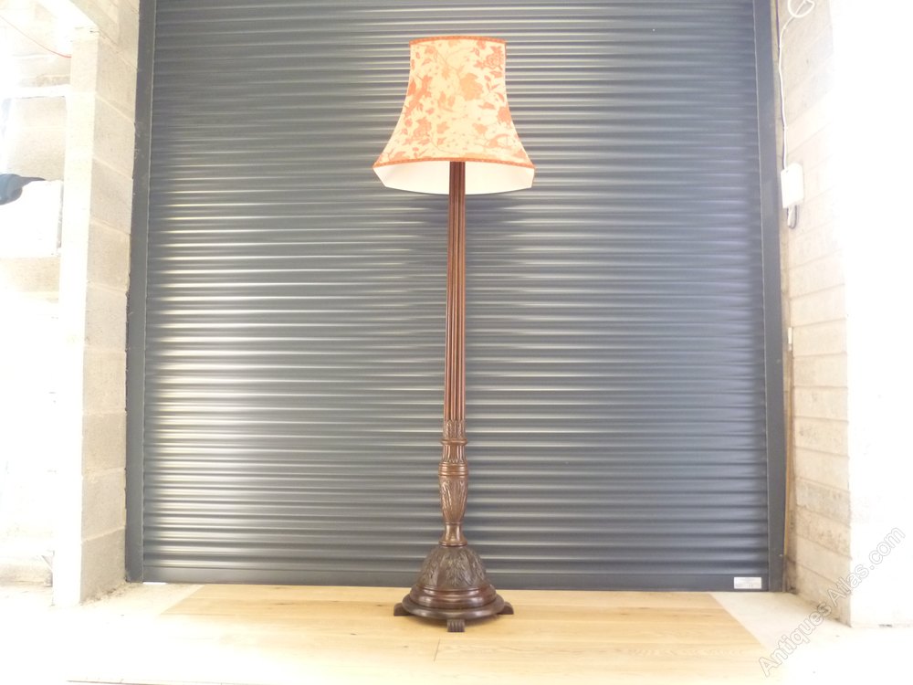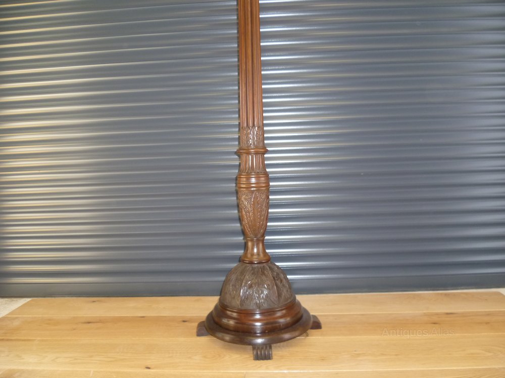 Mahogany floor standard lamp fluted Colum carved bell shaped base on flat carved feet. shade included, size 74" to top of shade and 63" top of bulb holder.
