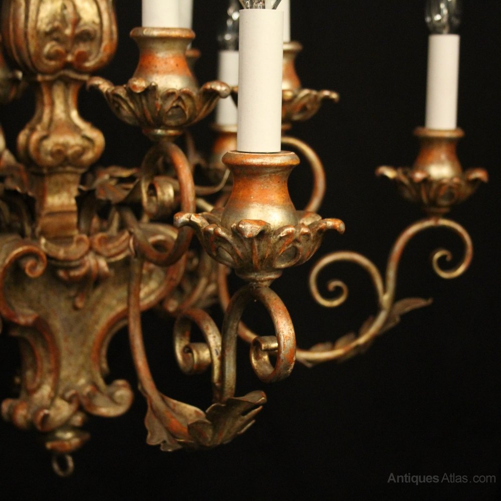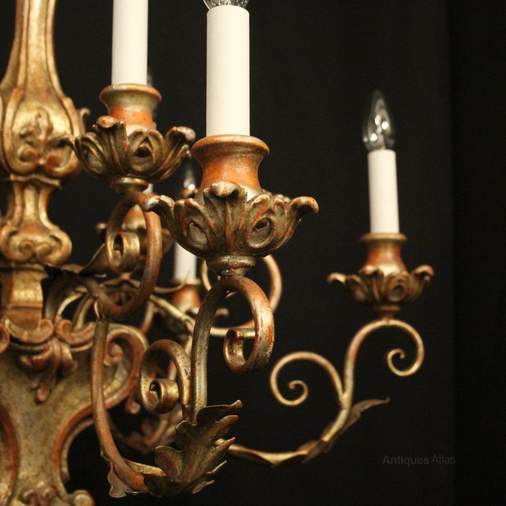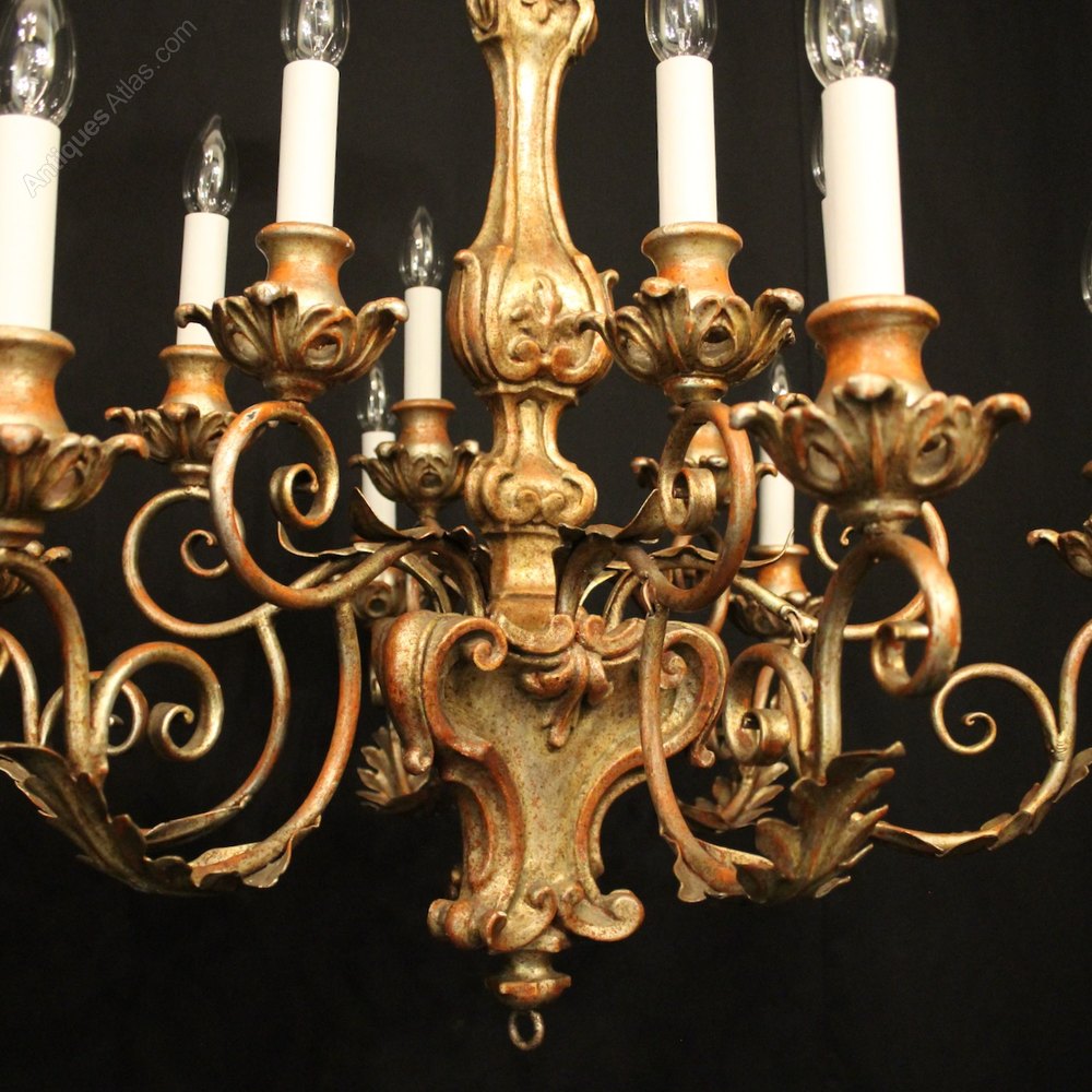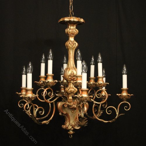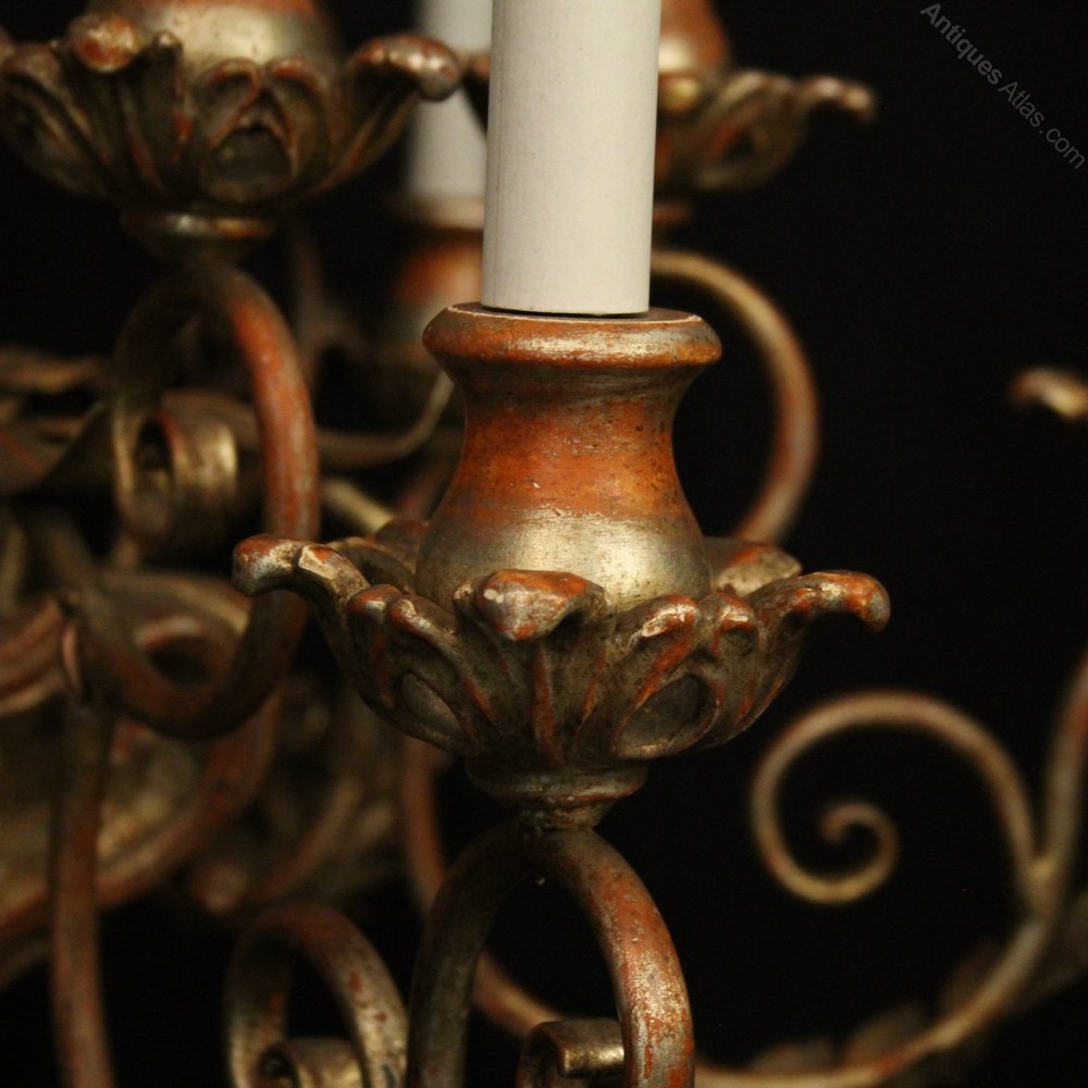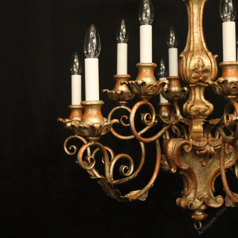 A lovely Italian Florentine carved wooden polychrome 12 light double tiered antique chandelier, the Acanthus toleware leaf scrolling arms with carved wooden millgrain bulbous candle sconces, issuing from an elaborate baluster central column with leaf decorative embellishments, having the original chain and ceiling rose, nice patination with original coloration and good large scale. Fully rewired and PAT tested. All our chandeliers come with ceiling fixings and spare bulbs.
