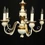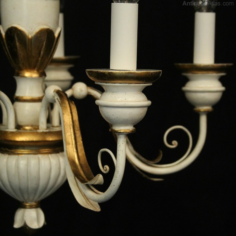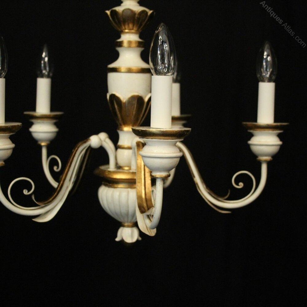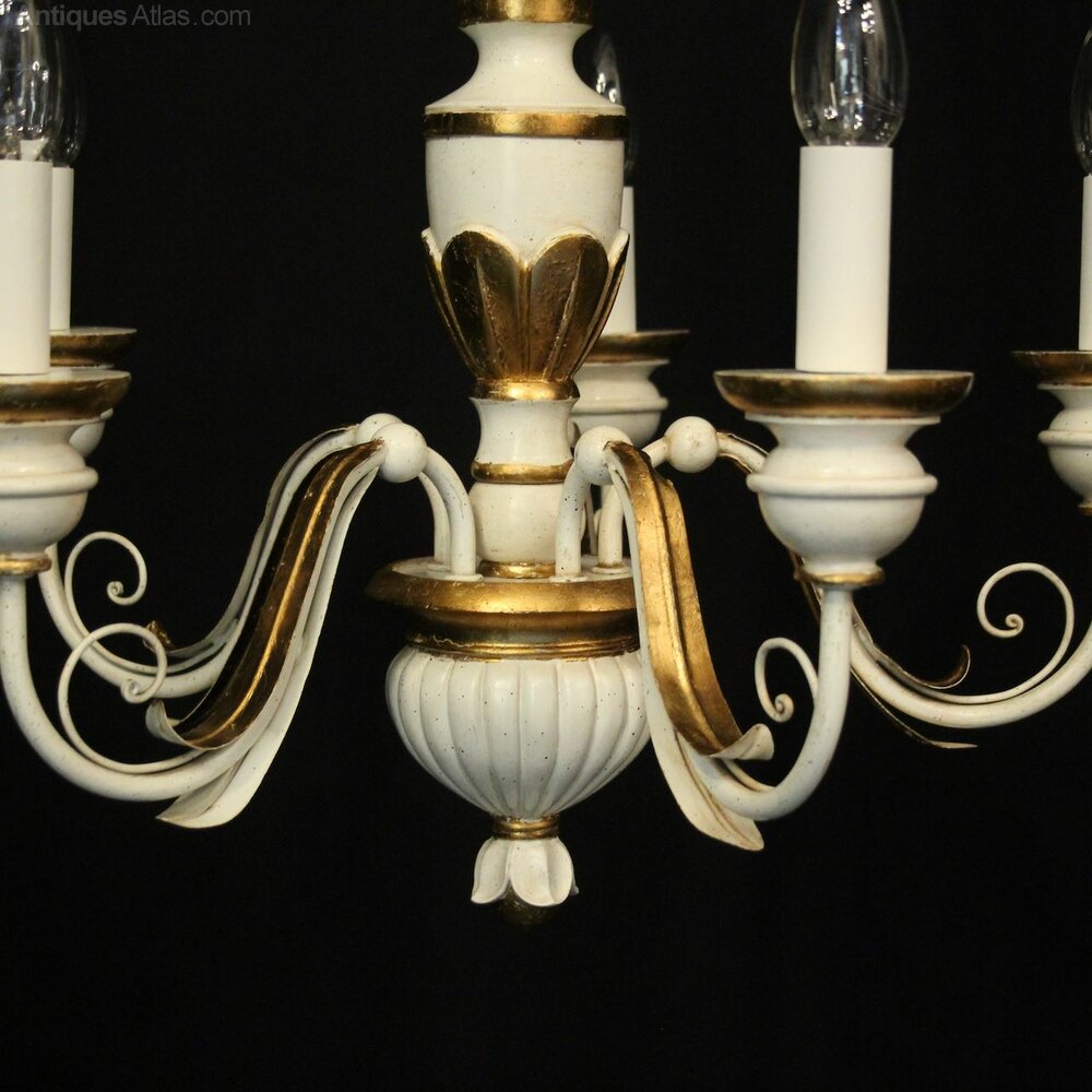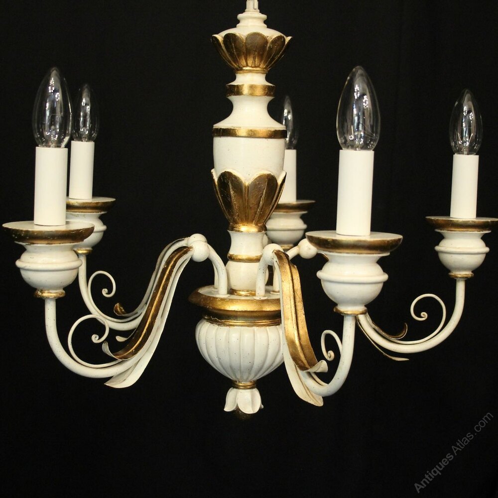 A decorative Italian polychrome wooden 5 light Florentine chandelier, the toleware leaf scrolling arms with wooden bulbous bobeche drip pans, issuing from a wooden baluster tapering central column, having the original chain and ceiling rose, nice original bright patination. Fully rewired and PAT tested. All our chandeliers come with ceiling fixings and spare bulbs.
