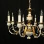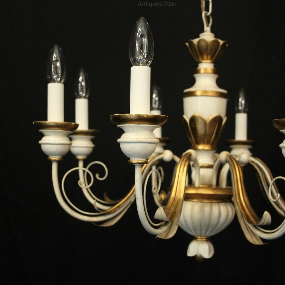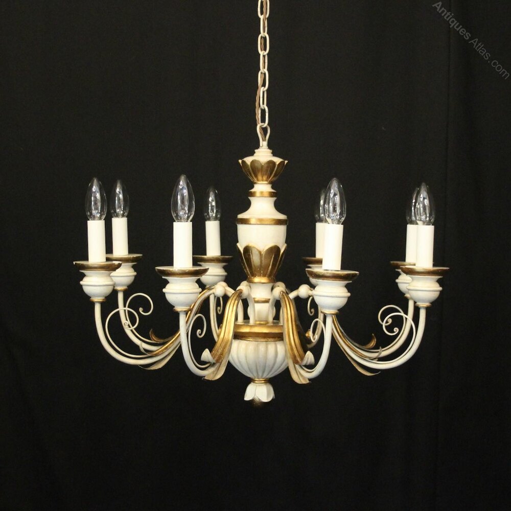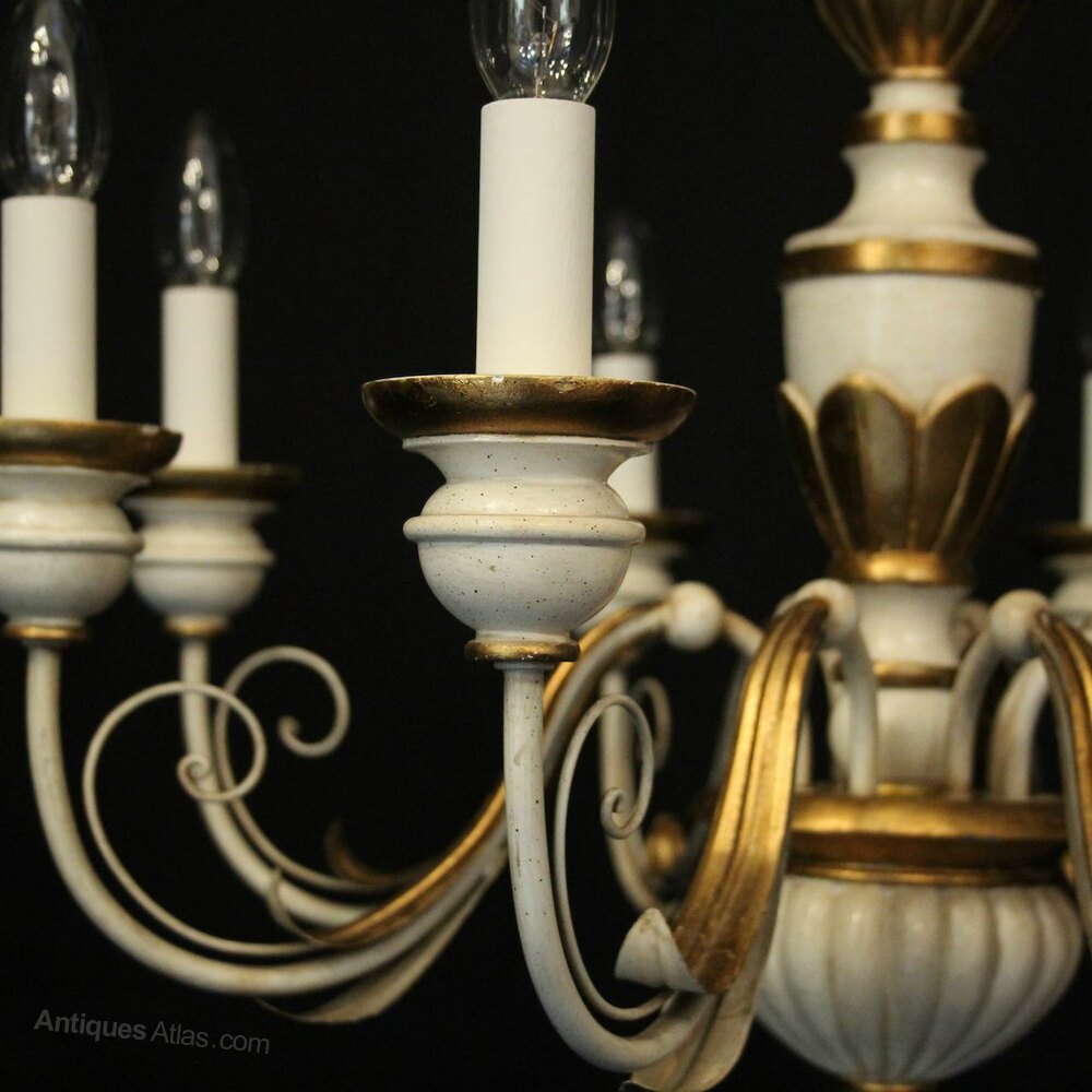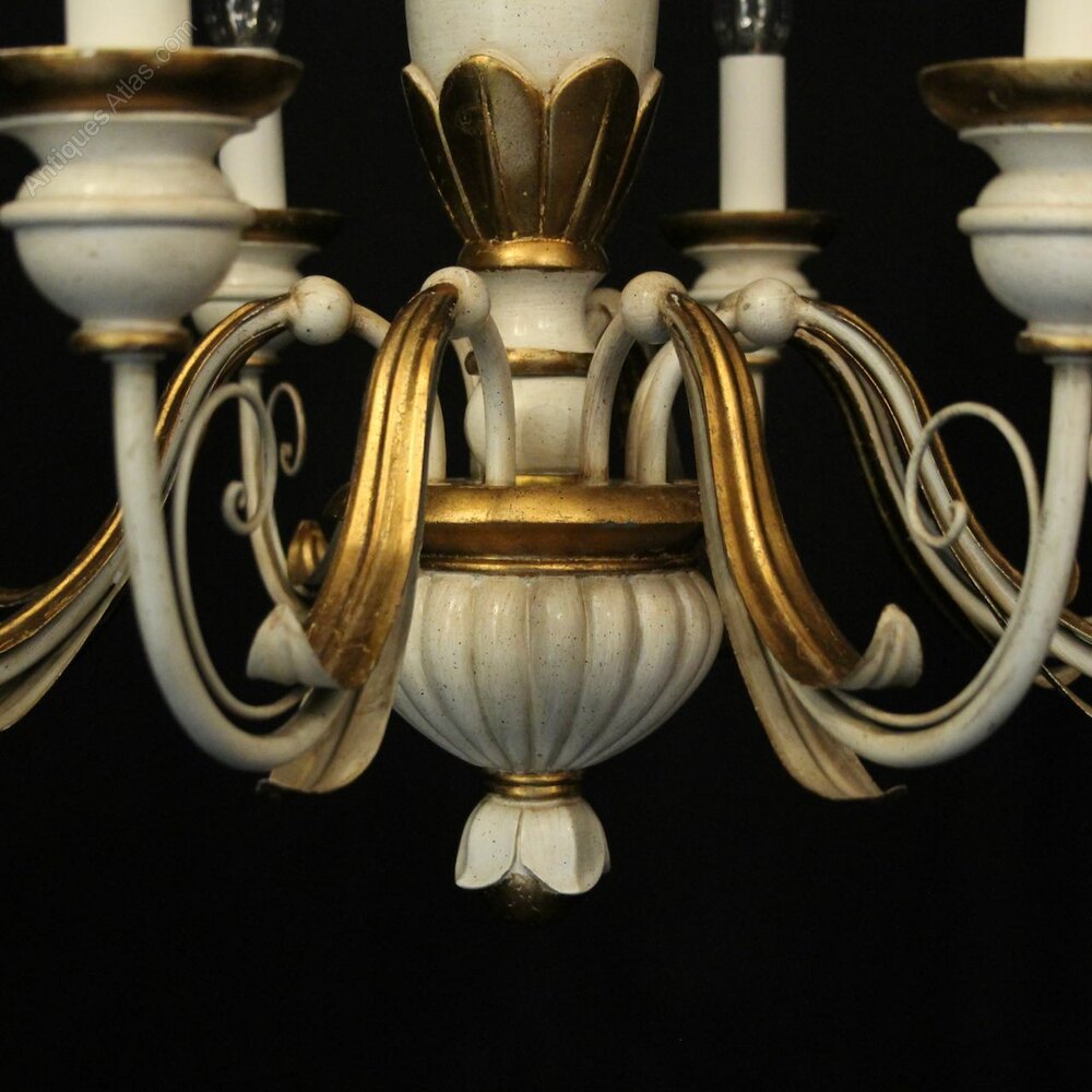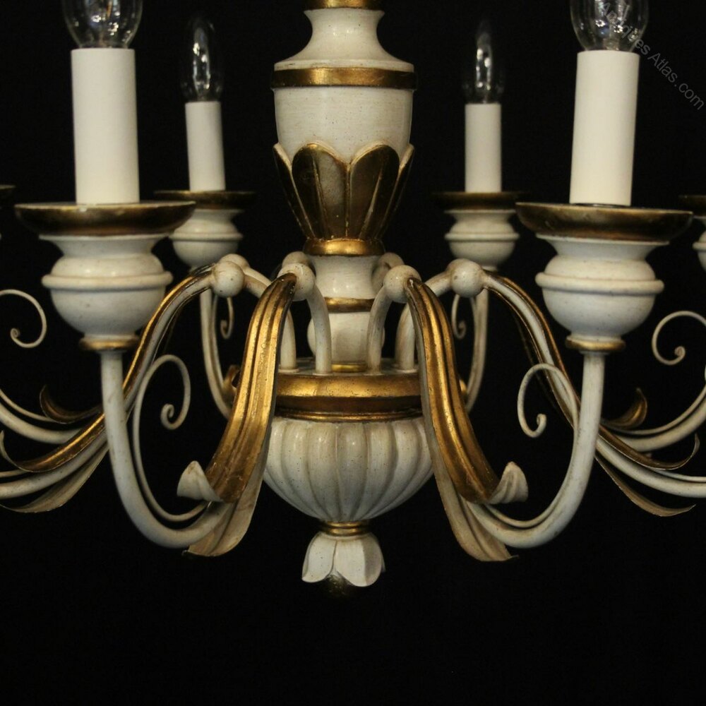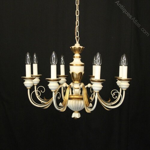 A decorative Italian polychrome wooden 8 light Florentine chandelier, the toleware leaf scrolling arms with wooden bulbous bobeche drip pans, issuing from a wooden baluster tapering central column and having the original chain and ceiling rose, nice original bright patination. Fully rewired and PAT tested. All our chandeliers come with ceiling fixings and spare bulbs.