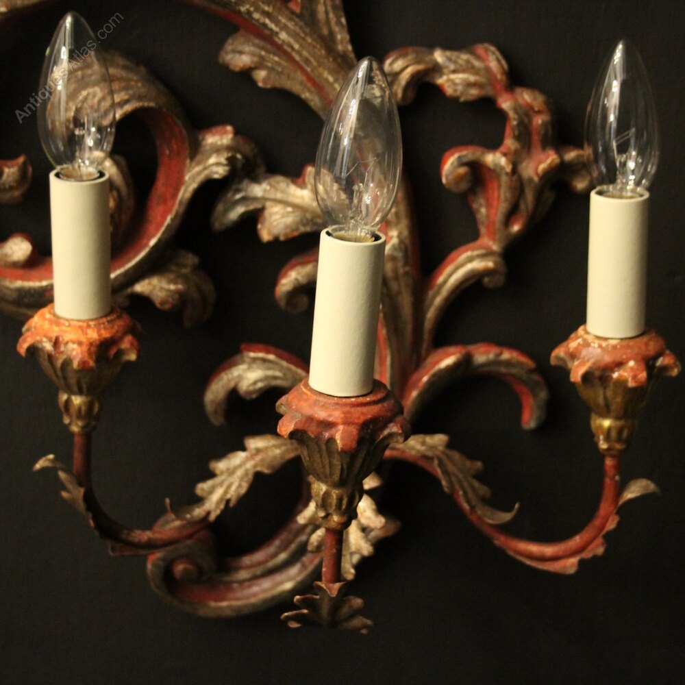 A decorative Italian Florentine carved giltwood and Toleware opposing triple arm antique wall lights, the foliated toleware leaf scrolling arms with wooden bulbous leaf candle sconces, issuing from an ornate pierced Acanthus leaf wooden opposing backplate, very decorative with nice original patination. The colours on the wall sconces are different red on left and silver patination on the right. Fully rewired and PAT tested. All our wall lights come with aged brass screws for fixing and spare bulbs.