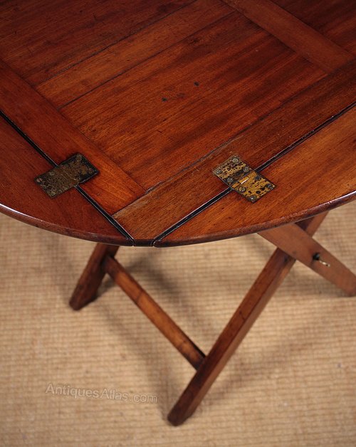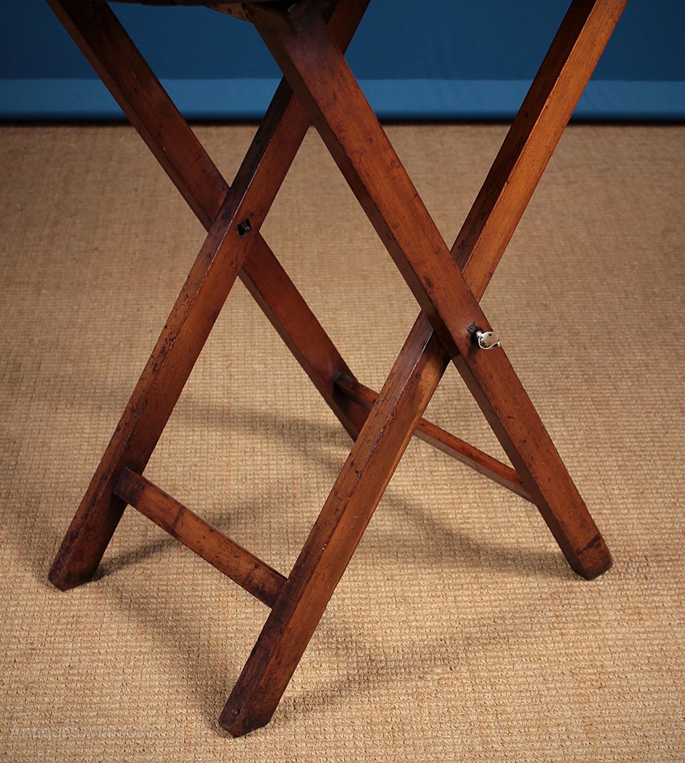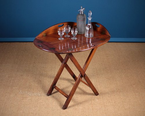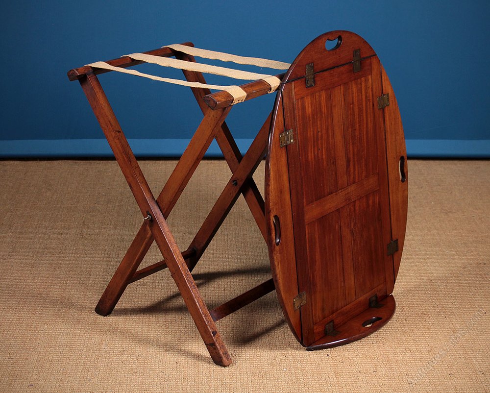 Superb late 19th.c. campaign type butler’s tray on stand c.1880. Mahogany tray with pierced grips and brass hinges, allowing the sides to fold flat to make an oval side table (and allow it to be stored flat when not in use). Simple folding mahogany stand with fresh webbing. Excellent condition, cleaned and polished in our workshops.