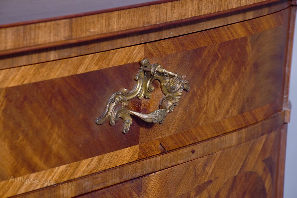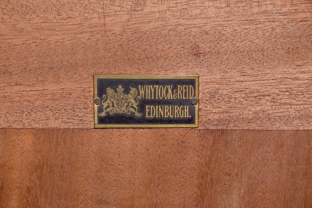 Circa 1910. An exhibition quality mahogany and inlaid folio cabinet by ‘Whytock & Reid of Edinburgh’, designed in the French taste the solid shaped top with beaded and cross banded fore-edge, he front with a pair of curved doors with French Rococo gilded handles, with Kingwood banding, beneath a pair of curved inlaid marquetry doors, which open to reveal two banks with pull out shaped folio trays each with a pair of pierced handgrips, the gables with panels in finest feathered mahogany, the fore-edges with inlaid panels, beneath the doors there is a shaped frieze that follows the forms of the doors, all resting on stylish Whytock & Reid Lorimer-style feet
