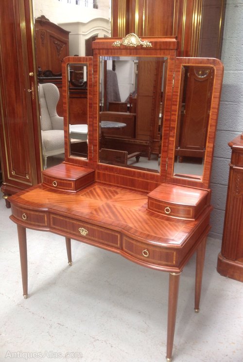 The dressing table comprises of three framed mirrors above two trinket drawers.