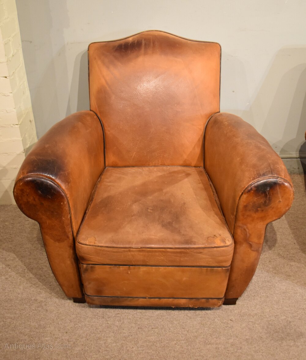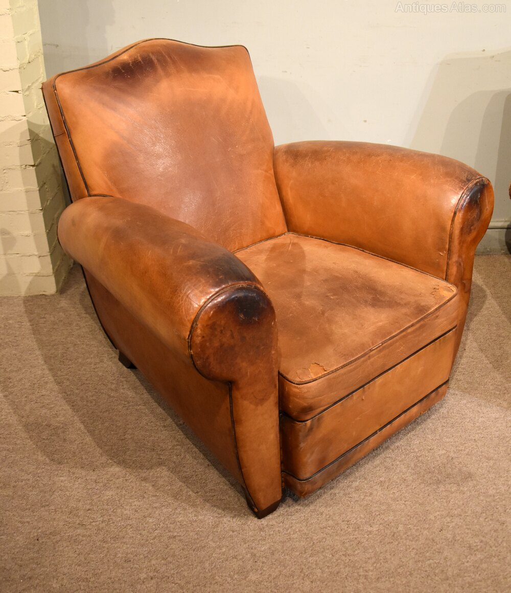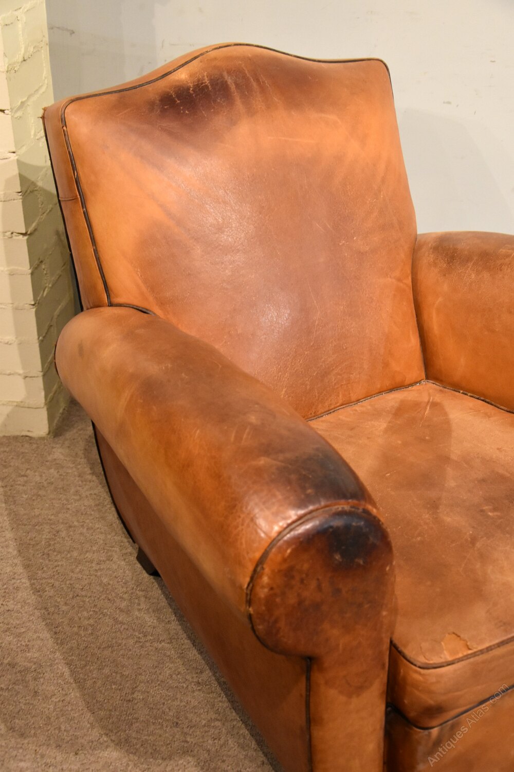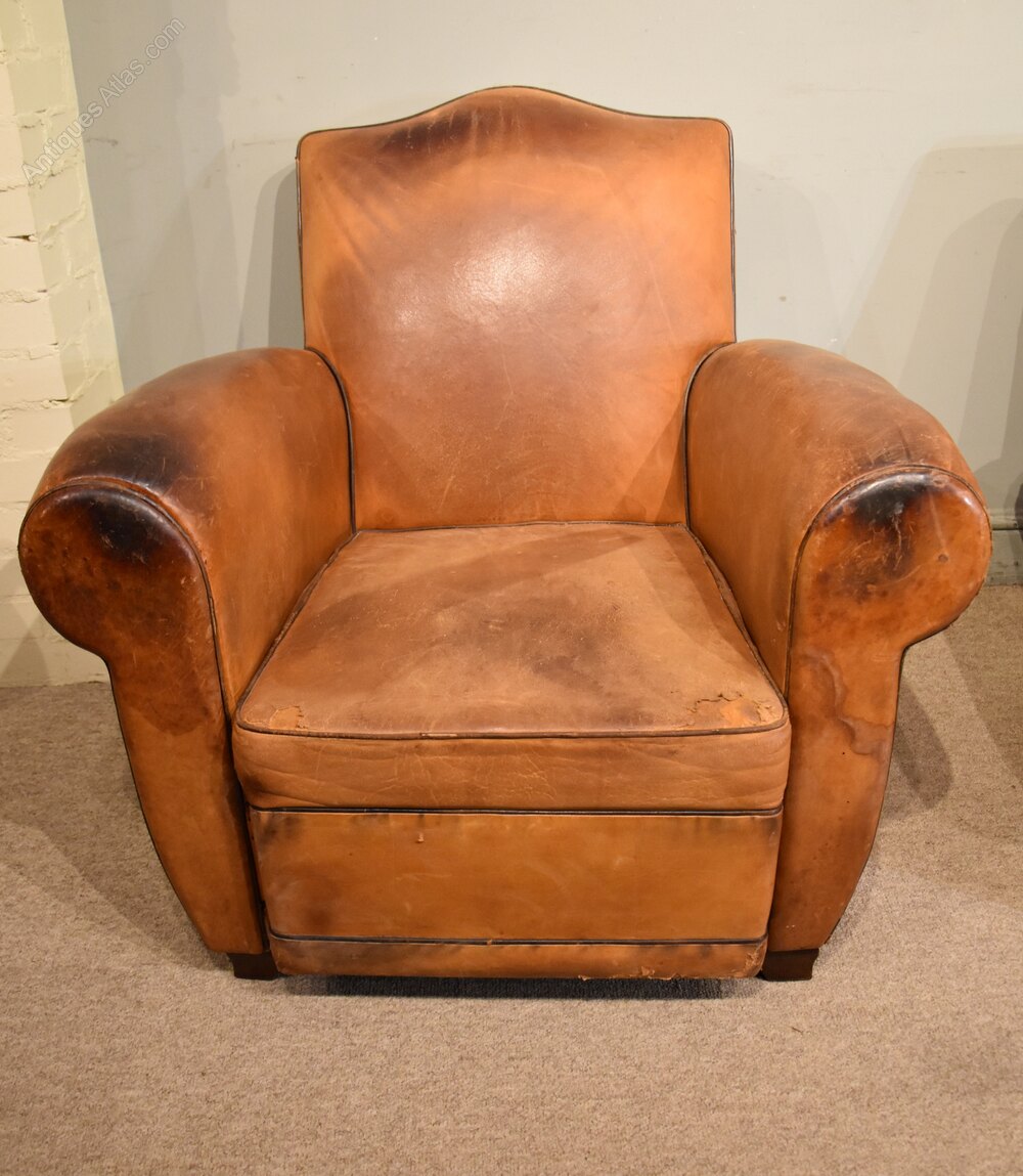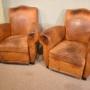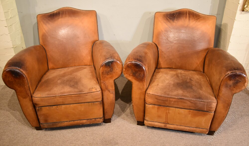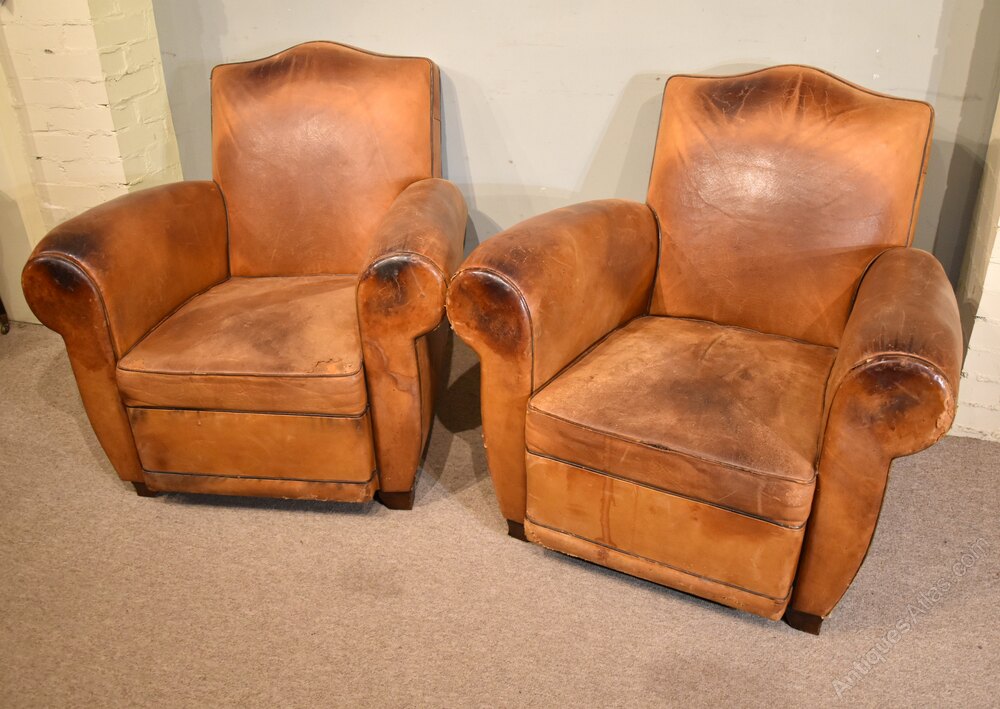 A superb pair of French art deco period leather club armchairs in wonderful original condition with superb patina and fading. The chairs are deep sprung and very comfortable.