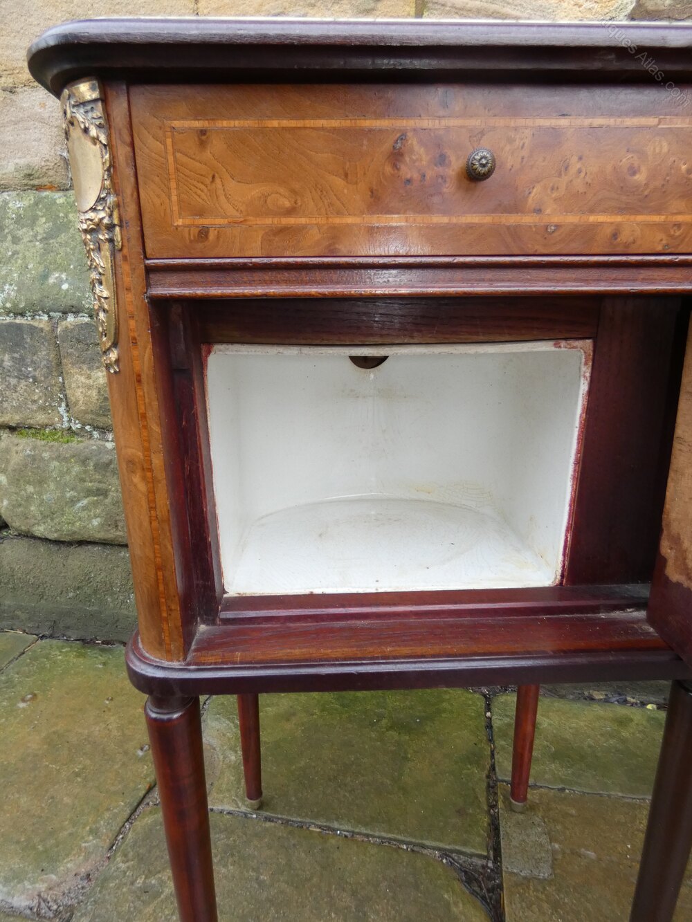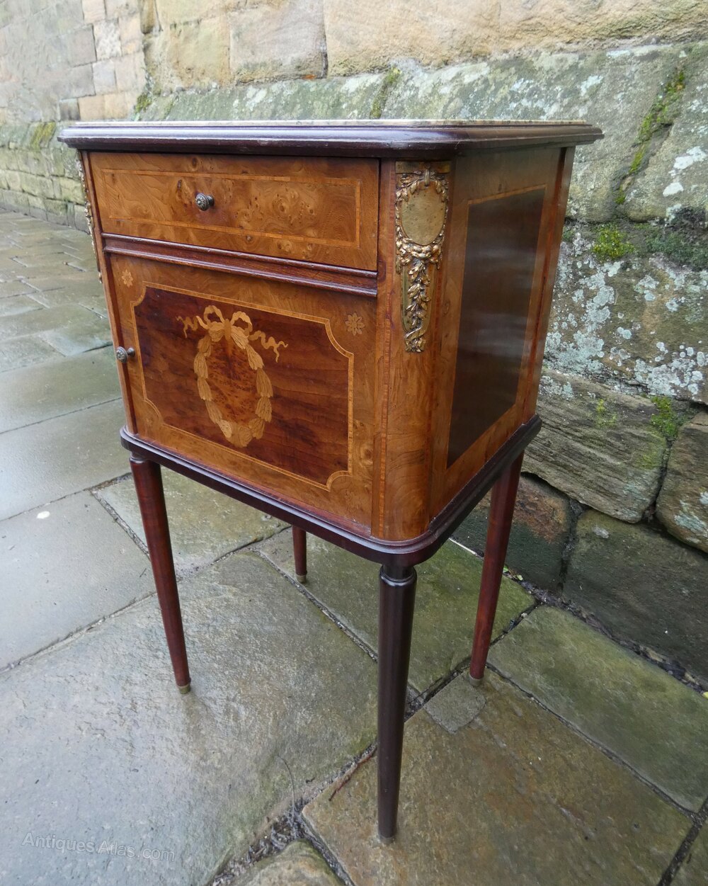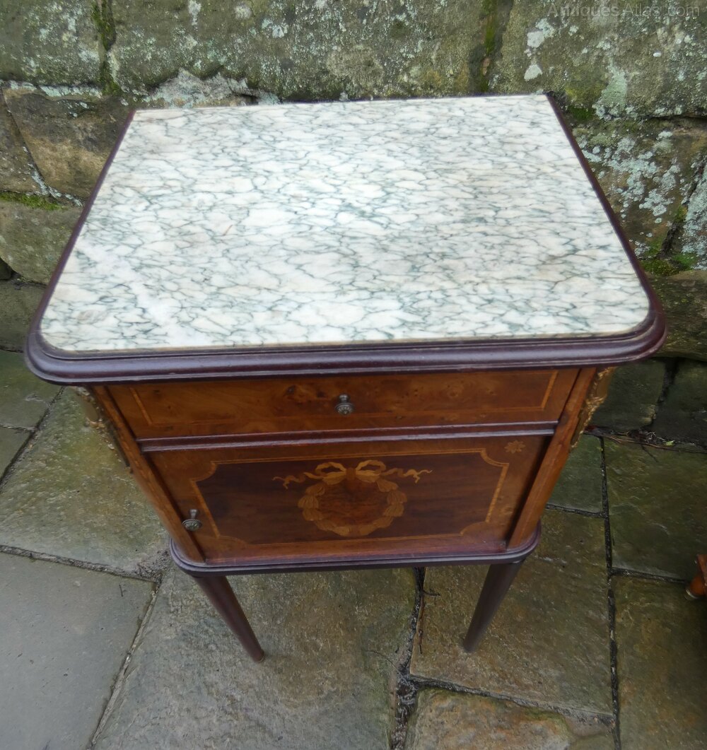 French bedside cabinet with green veined marble top, frieze drawer with beautifully inlaid cupboard door below opening to interior with ceramic liner, raised on elegant tapering legs.