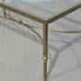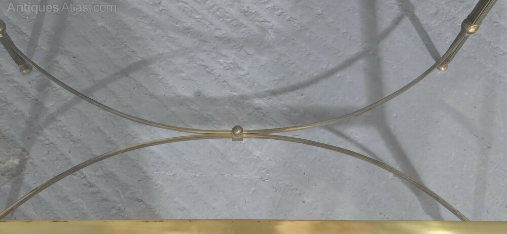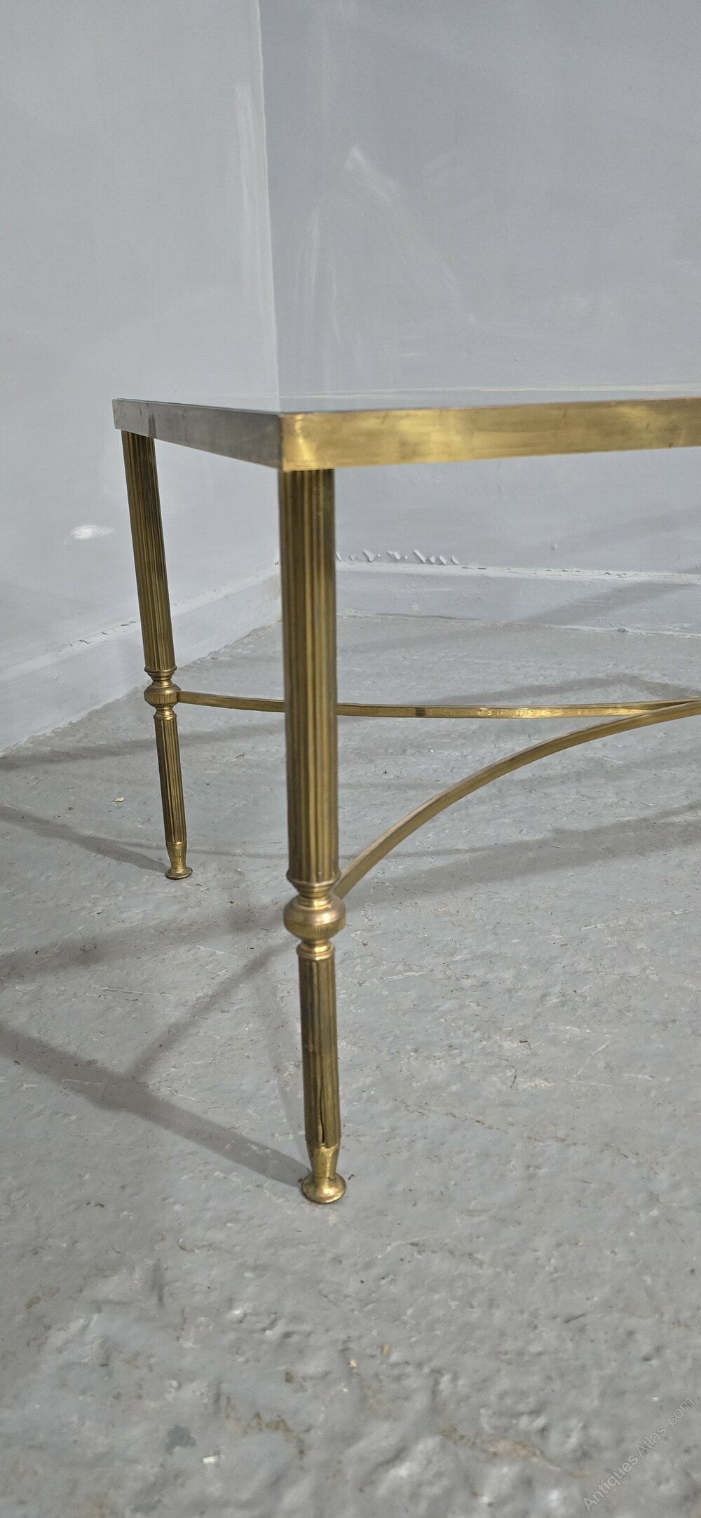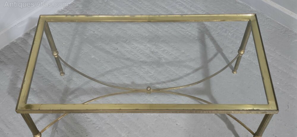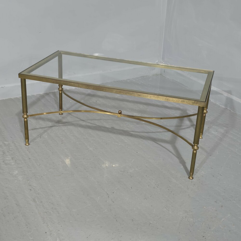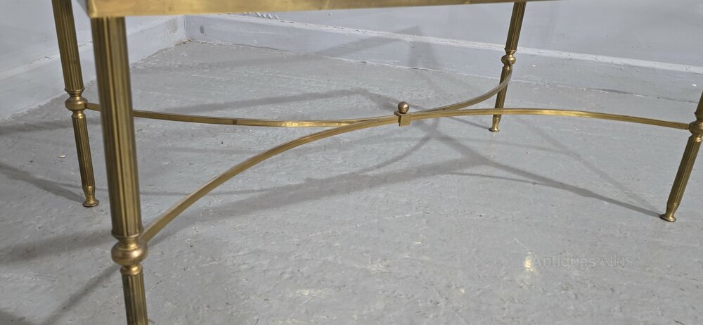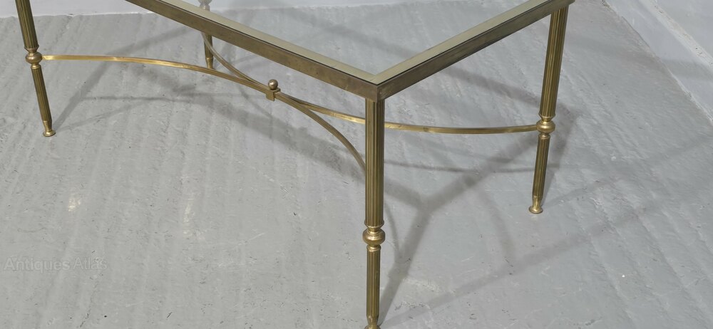 A super French Maison Jensen style brass coffee table with clear glass top and U shaped understretcher, reeded legs, in overall great condition.