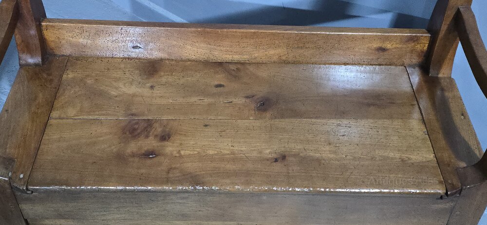 A super French cherrywood monks bench or hall bench, solid panels with lift and slide lid, excellent colour and lovely condition.