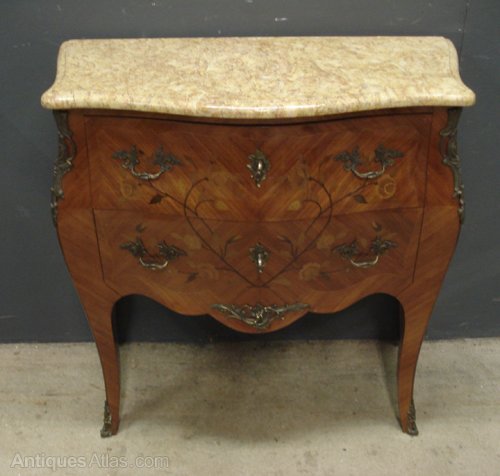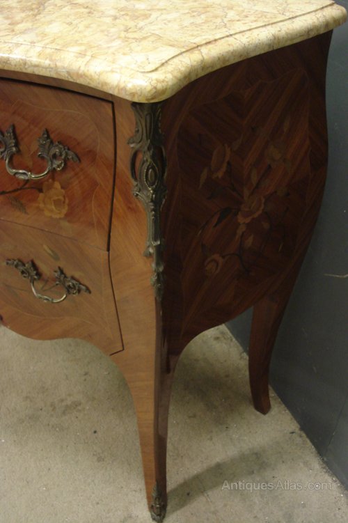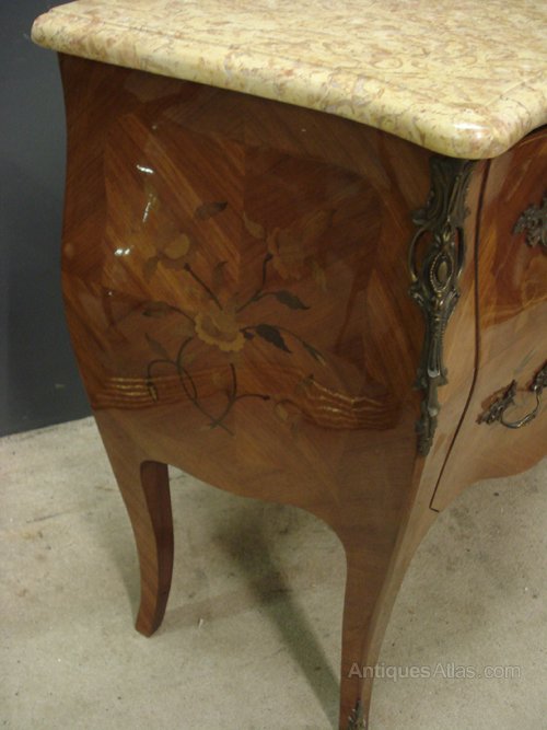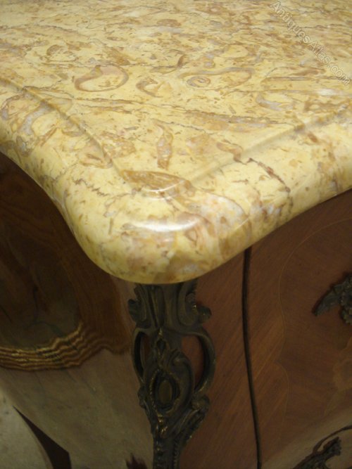 Ref 6341 - French Louis XV style two drawer inlaid/veneered commode. Original shaped marble top. Original brass fittings. Working locks with two keys. Circa 1950.