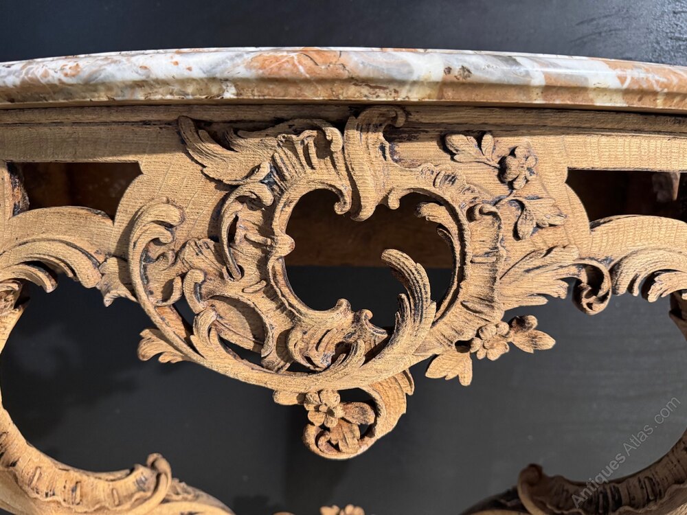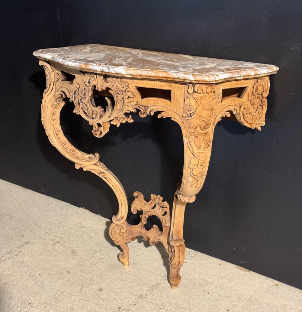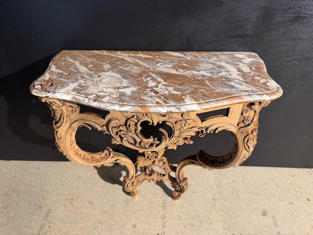 French Oak Console Table with original variegated rouge marble top. Lovely rococo scrolls and carvings. We have bleached it for a lighter look and in excellent original condition for the home. Height 82 cm Width 76 cm Depth 40 cm