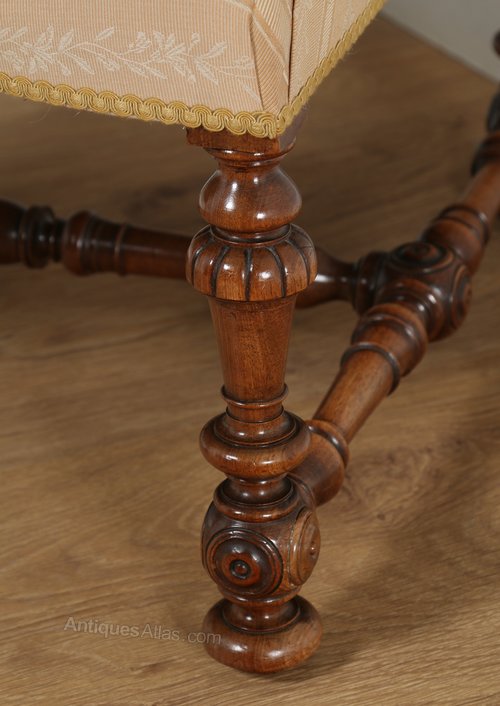 Here is a very good quality antique French Duchess walnut footstool, in the Carolean style, circa 1870, which has been newly upholstered.