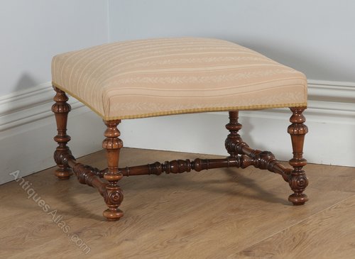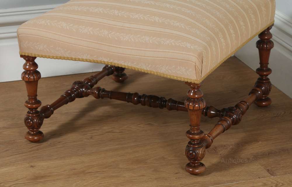 Condition This footstool is in good condition. The stool has been newly upholstered in top quality hard wearing woven wool and cotton structured fabric, with matching braiding. The upholstery is therefore new, clean and free from any wear, dirt or damage. Nominal old use marks to the leading edges of the walnut frame, but nothing significant considering the age of the item. Importantly, there are no breaks to the arms or legs. This item is solid in joint and ready to use.