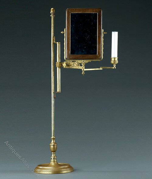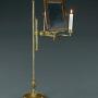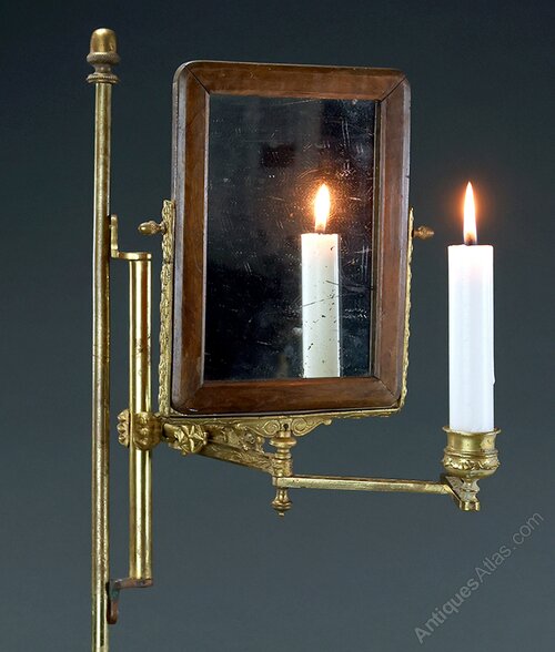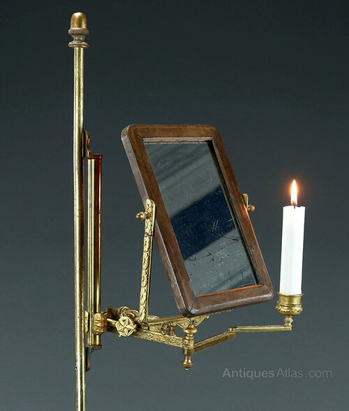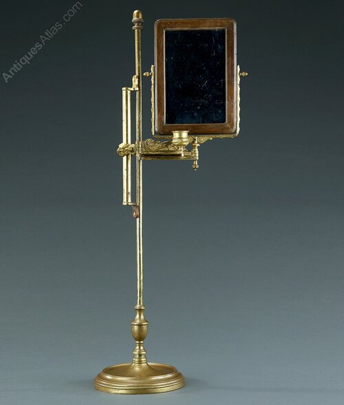Very rare and beautiful early 19th century French Empire gilt bronze barber's or shaving mirror. Rectangular shaped pivoting mahogany framed mirror with original glass and candle arm. Foral decoration with acorn finials and adjustable star shaped key with lion claw feet clamp. Possibly later stand. Could be removed for wall mounting. Evocative period item and a rare survivor. French, circa 1825.