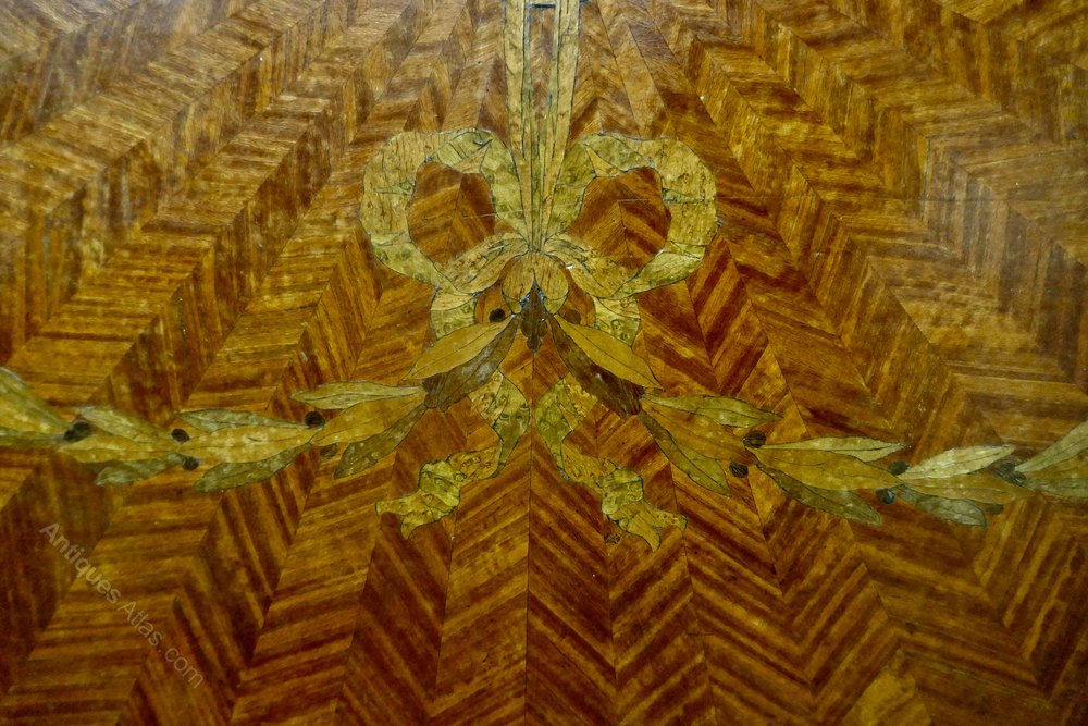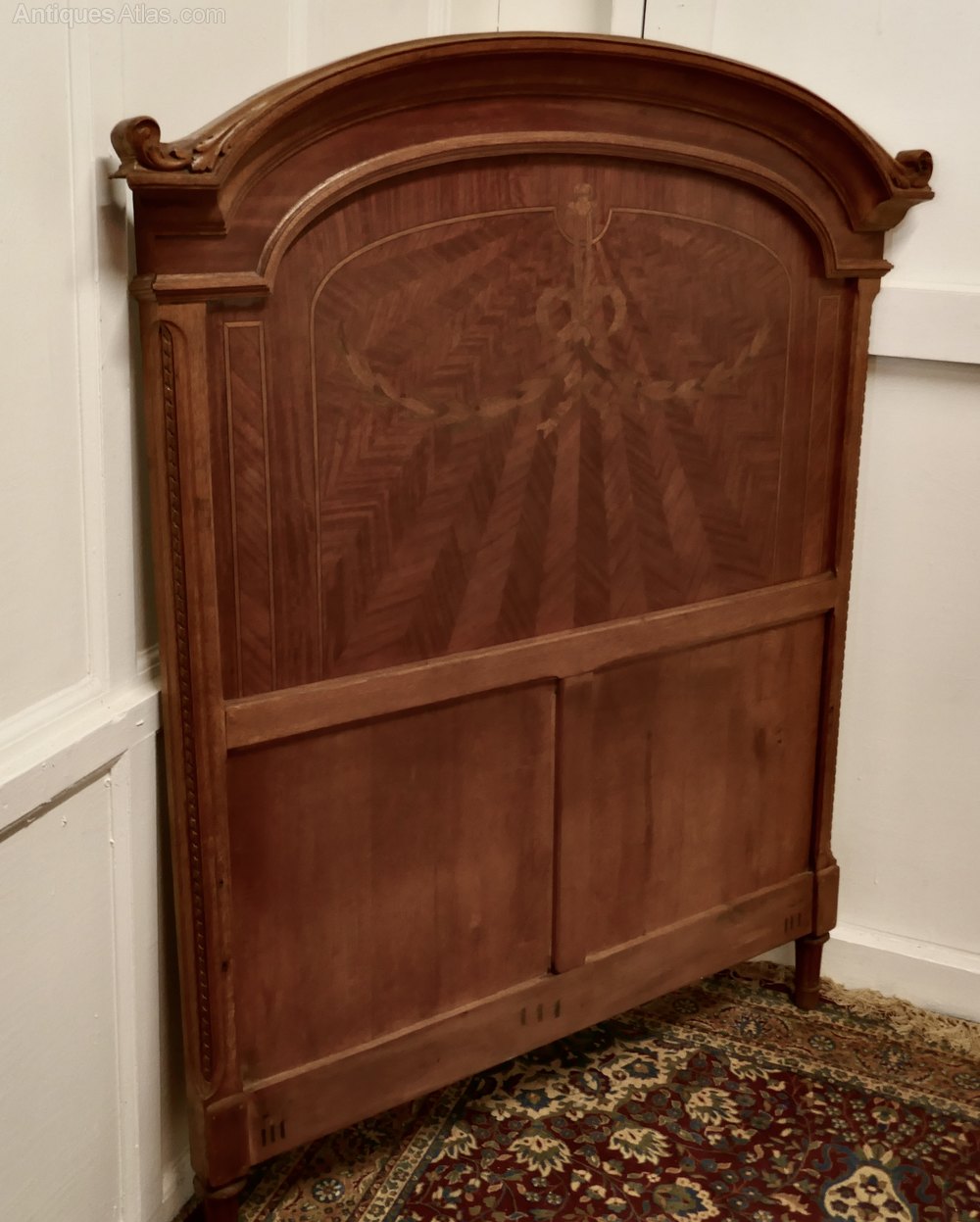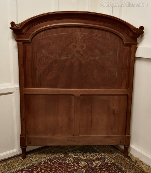 The headboard is beautifully inlaid it has a Curved Carved Oak Top decorated with a Bow in inlaid in many woods