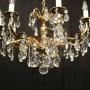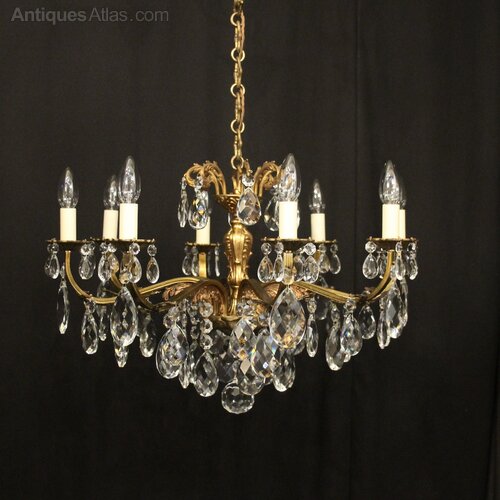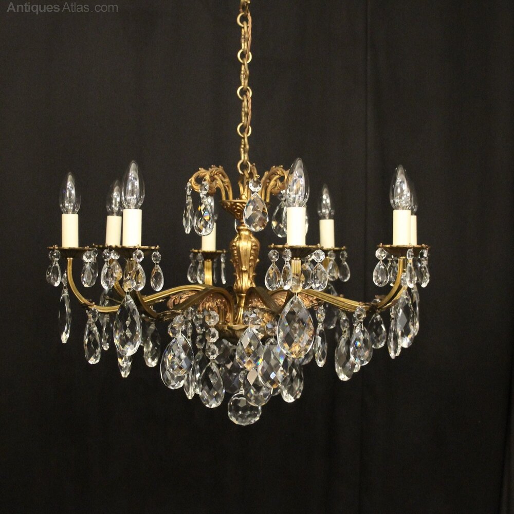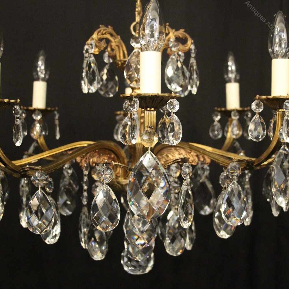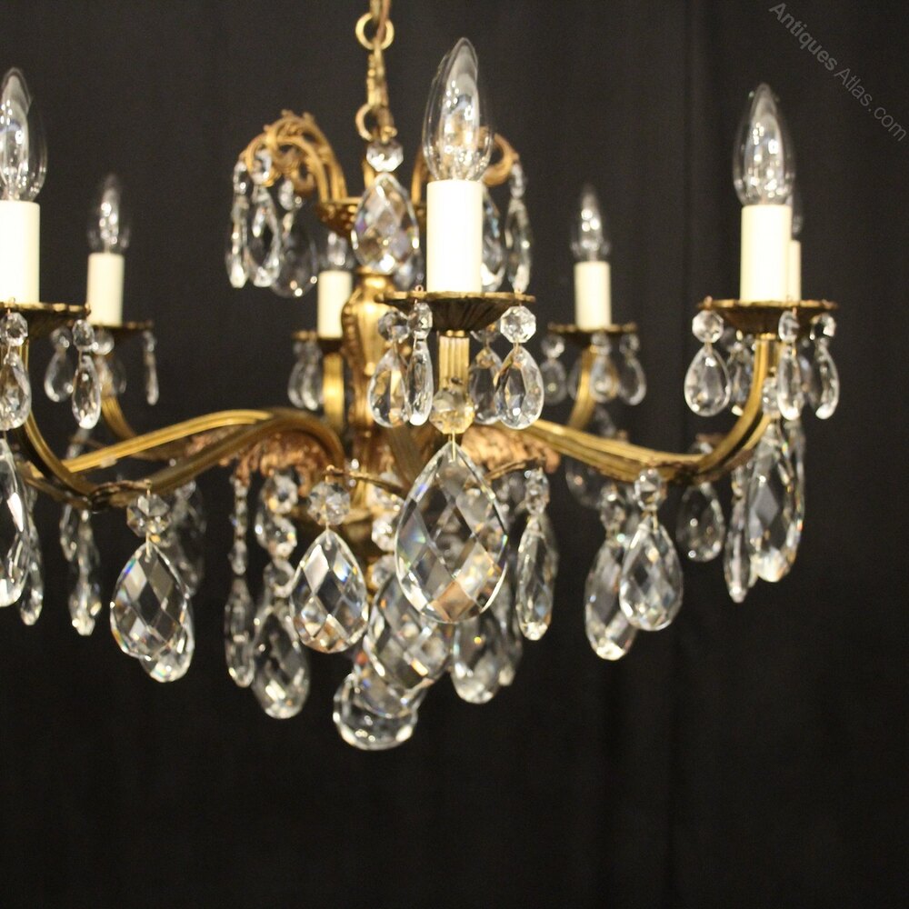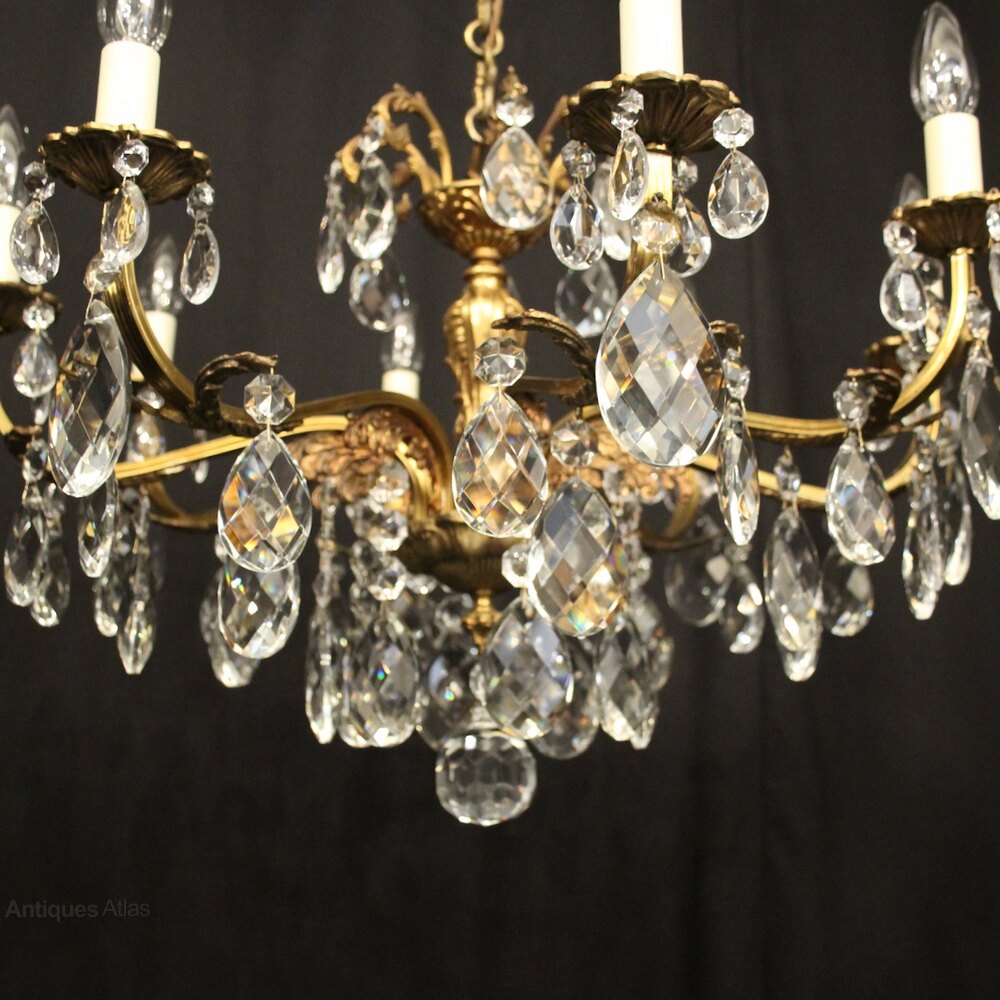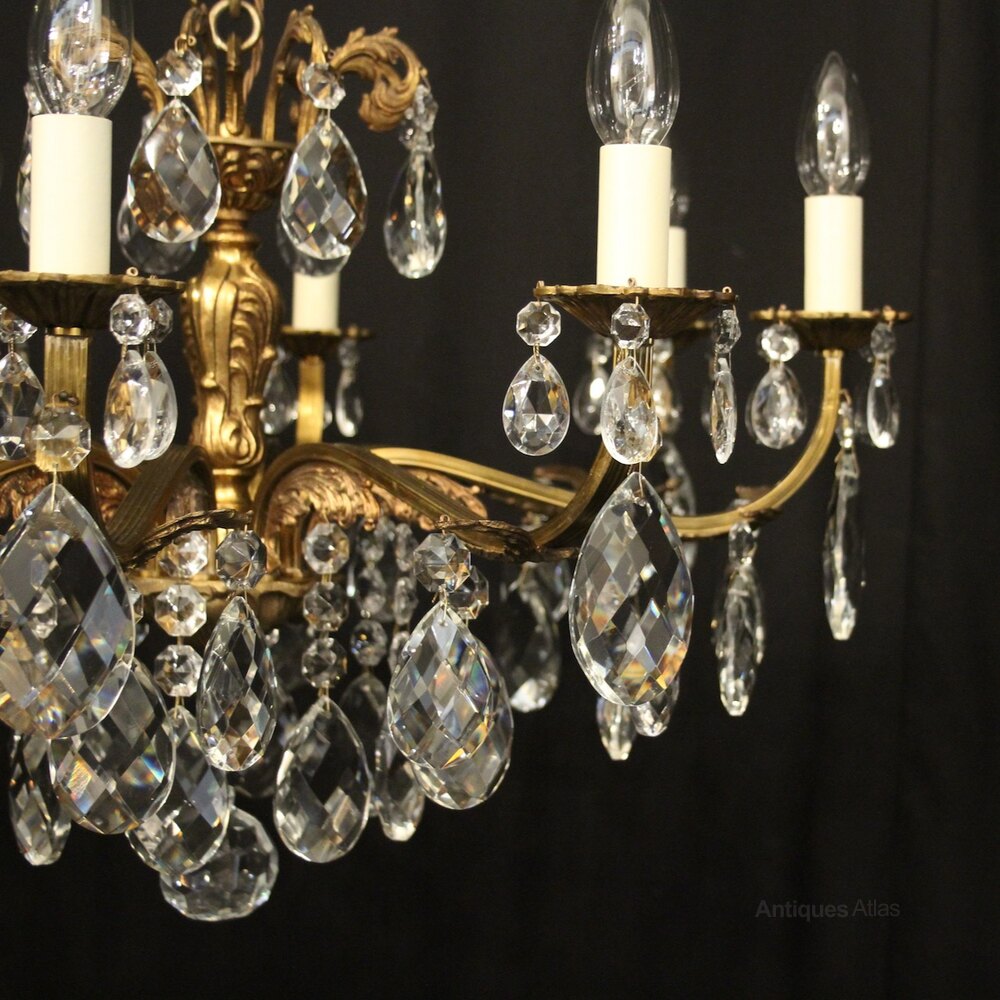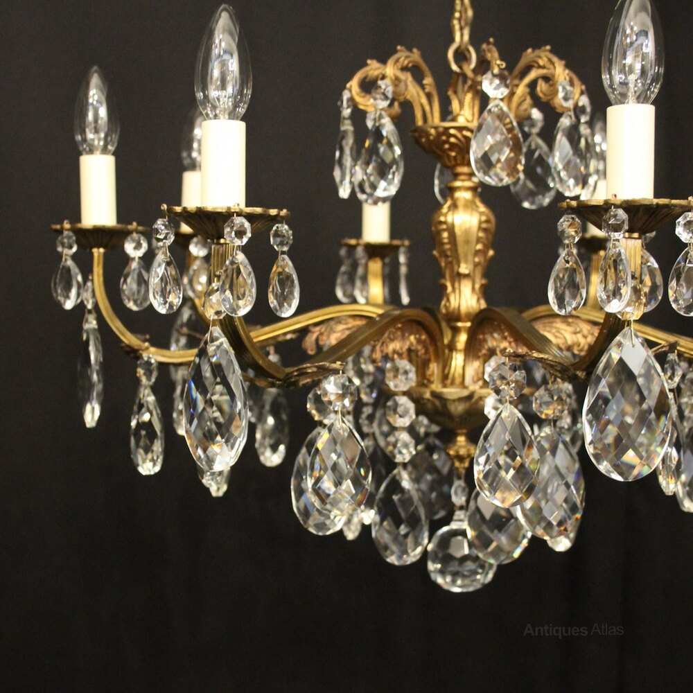 A French gilded brass and crystal 8 light antique chandelier, the reeded leaf clad scrolling arms with circular leaf bobeche drip pans, issuing from an ornate central column with leaf canopy, decorated with double pear faceted crystal pendants and having the original chain and ceiling rose. Nice wide proportions, ideal for low ceiling. Fully rewired and PAT tested. All our chandeliers come with ceiling fixings and spare bulbs.